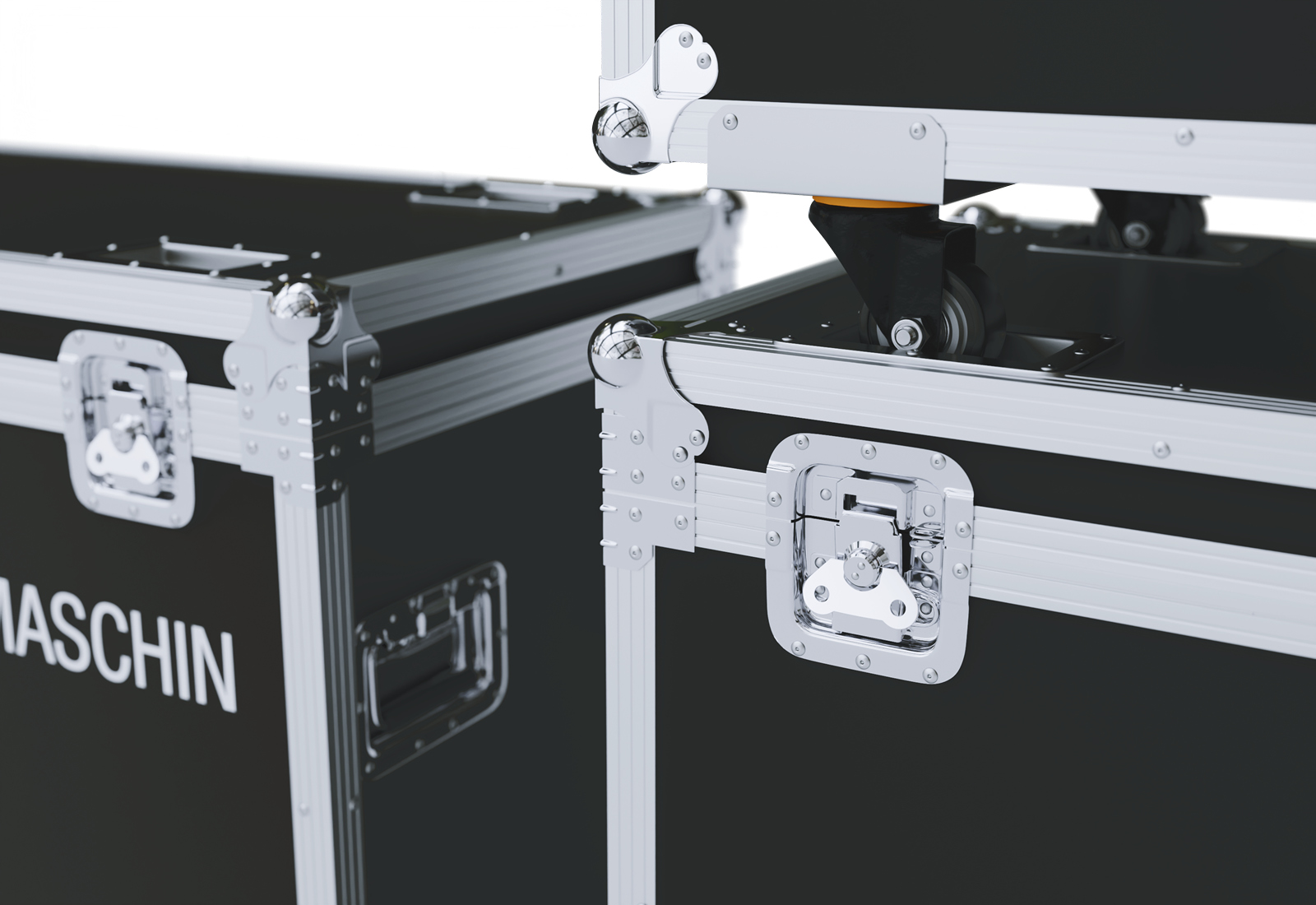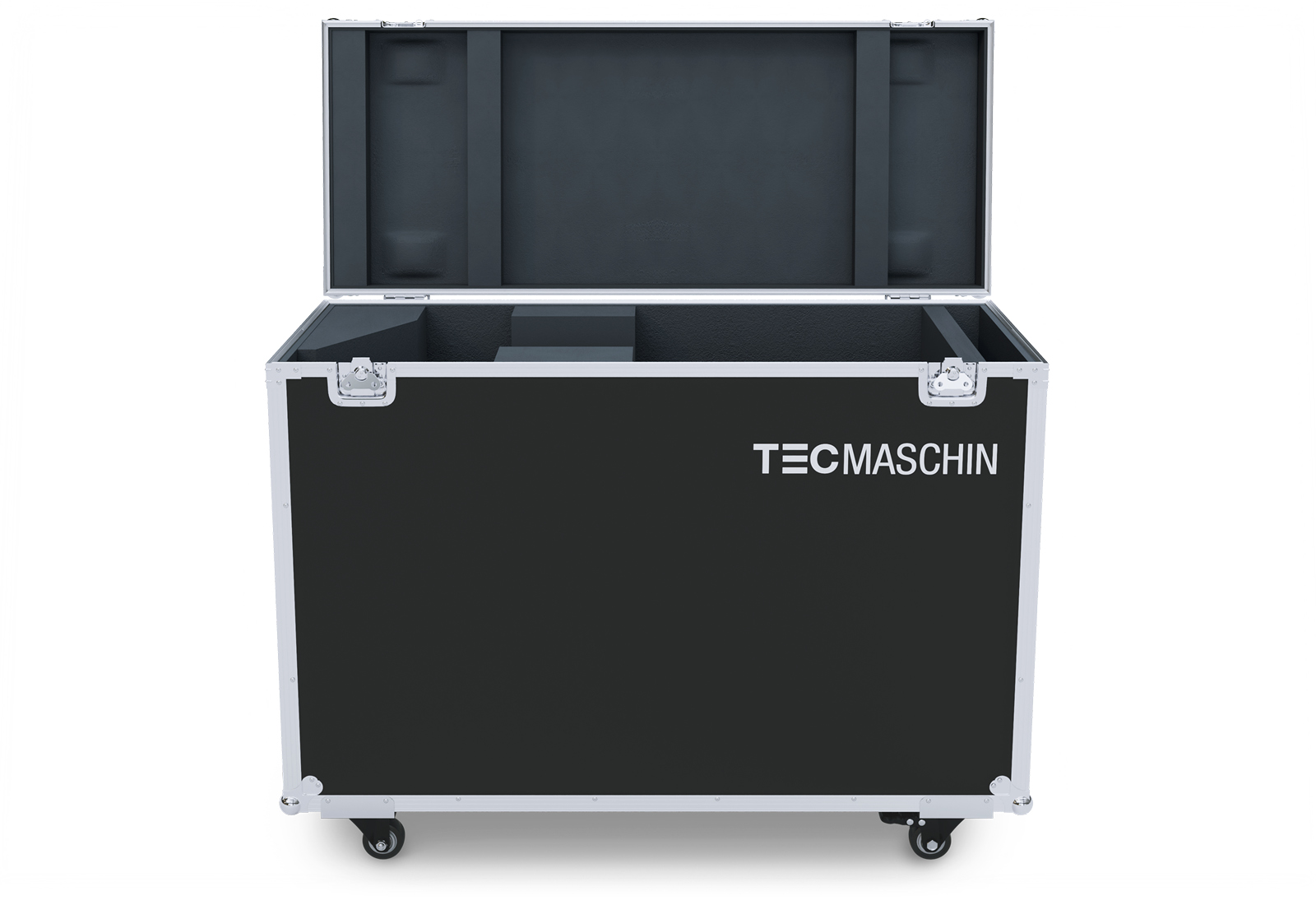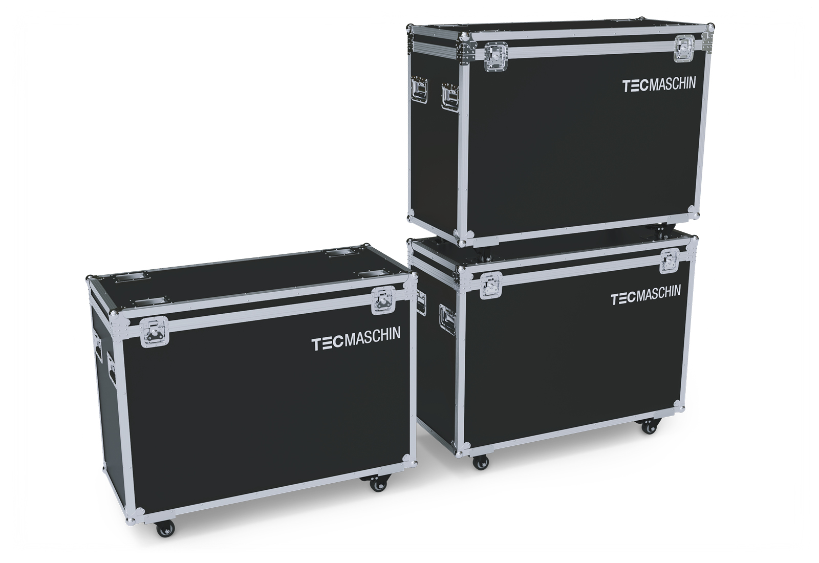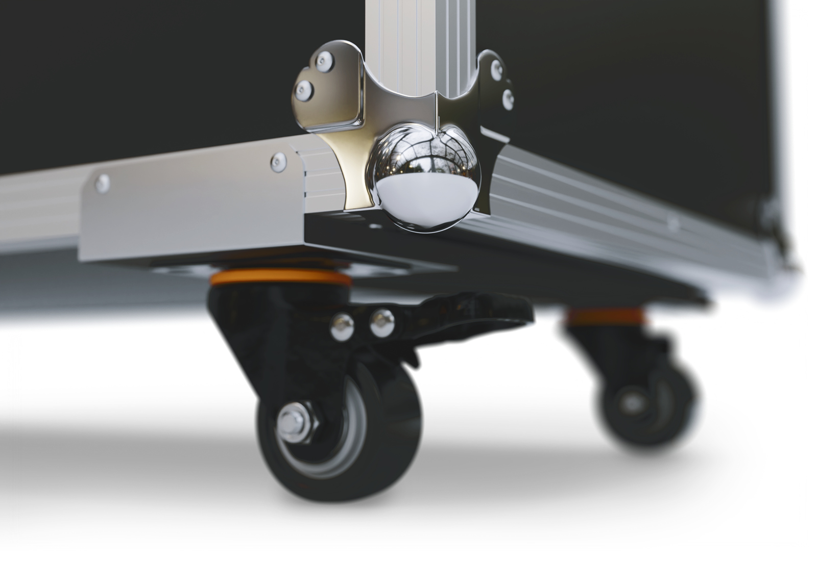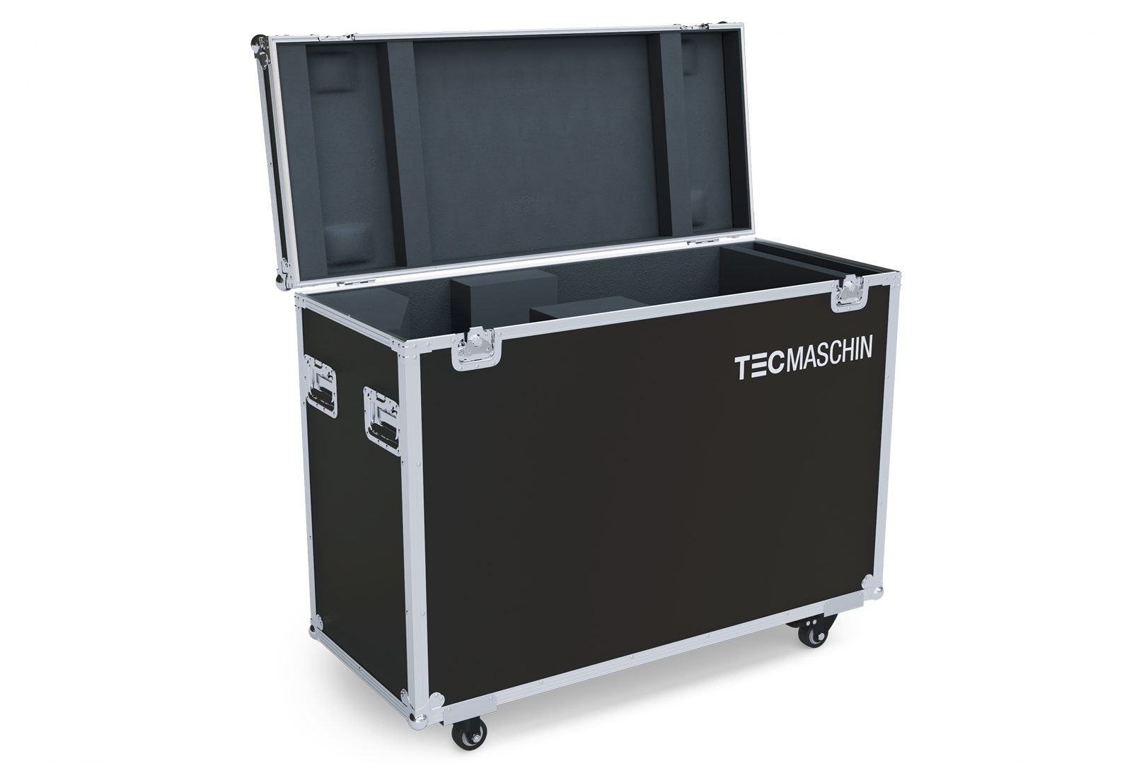 The external dimensions of the box are 1.230 mm in width, 510 mm in depth and 980 mm in height. The housing is made of 9 mm thick, black-coated wood, framed in aluminium profiles with reinforced steel corners. The transport box weighs 35 kg and is designed for a load of up to 120 kg.