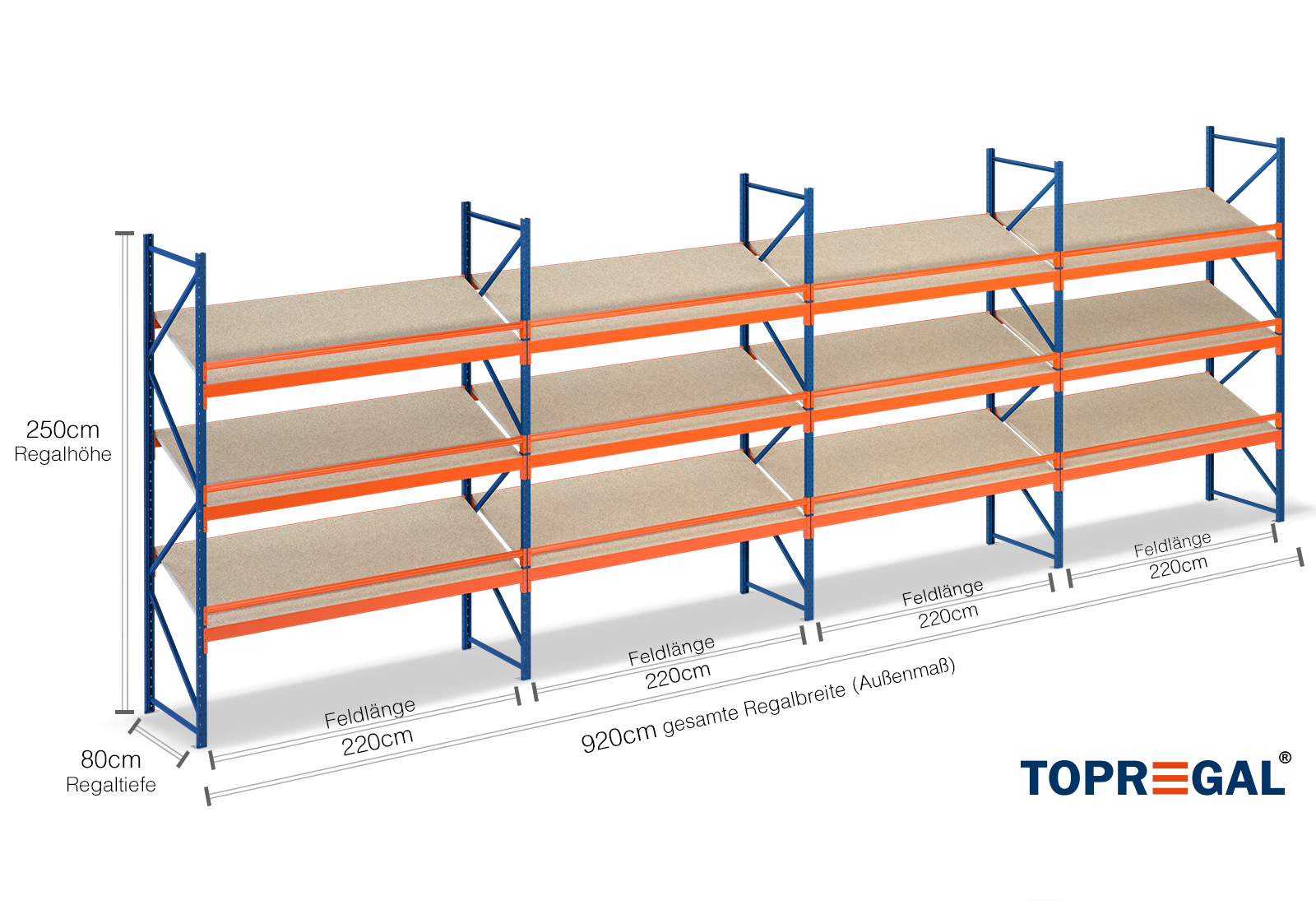 All data refer to evenly distributed loads. When loaded, the shelf load and field load must not be exceeded. In principle, the current guidelines on safety and health at work (german DGUV Rule 208-061) apply during use. TOPREGAL accepts no liability for accidents/damage caused by improper use. Our expert advisory team will be pleased to answer any questions you may have. Dimensions given are approximate and may deviate by a few centimetres. Contact us if you need the exact dimensions for your desired product.