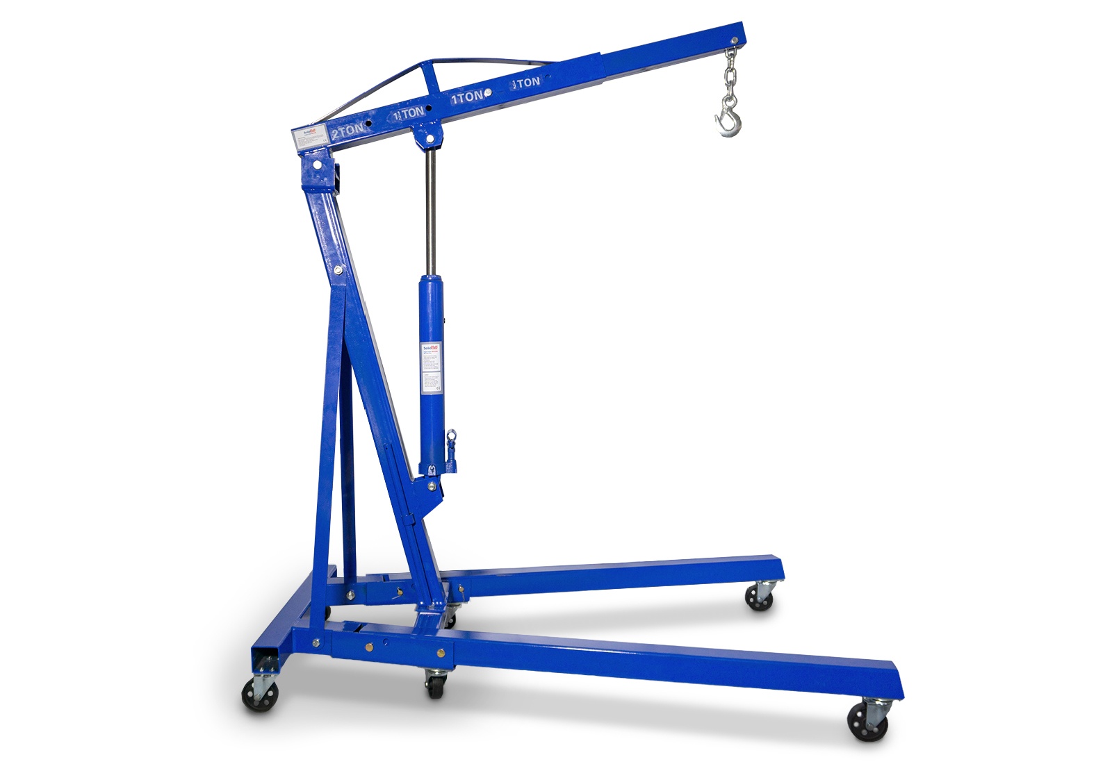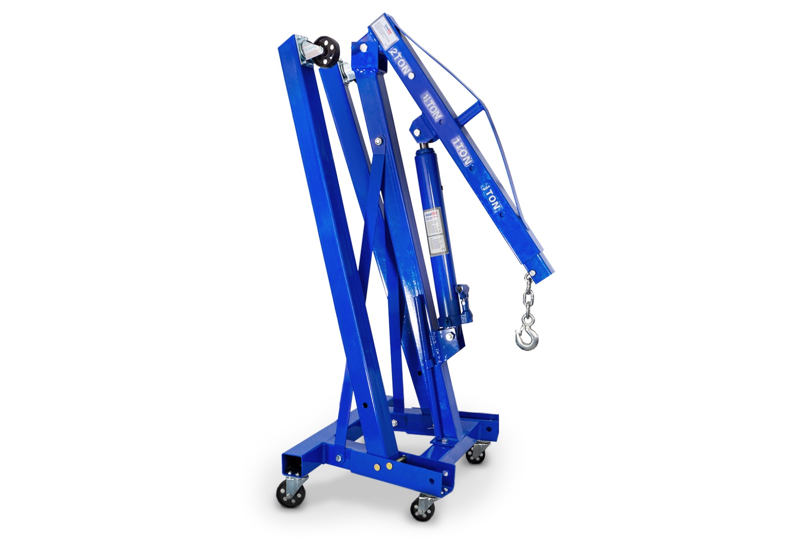 The assembled crane jib can also be extended in 4 stages between 104 and 154 cm. It is important to note that the maximum working load limit decreases depending on the position selected. The motor lifting crane can only lift a full 2.000 kg when the telescopic arm is fully retracted. When the telescopic arm is fully extended, the maximum working load limit is 500 kg.