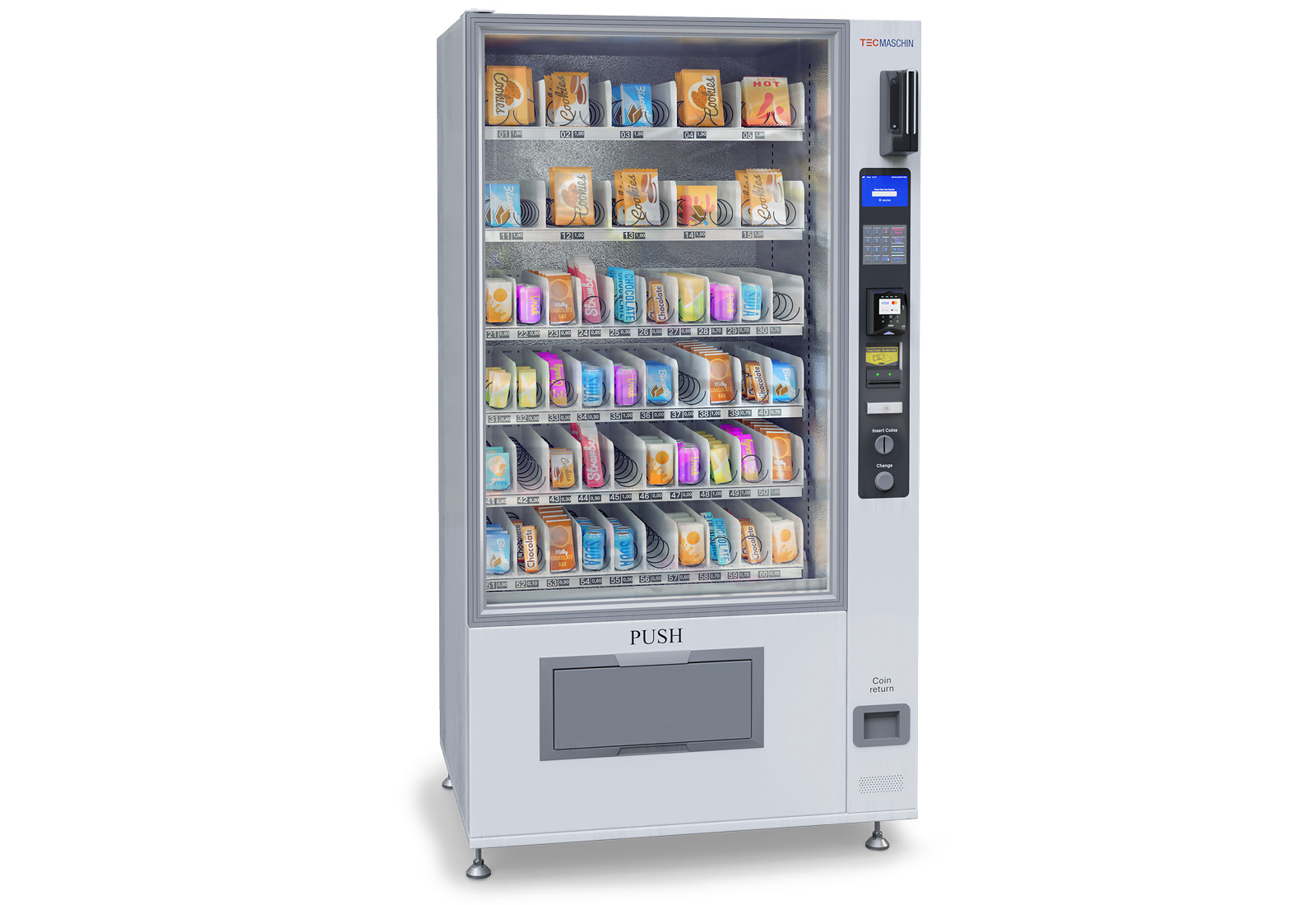 This is easily possible with the VA-6K Vending Machine from TecMaschin. The 1.030 mm x 790 mm x 1.945 mm can be placed in canteens, corridors or production halls / warehouses to match almost any interior. This way, your employees and customers who are on the move in your premises can supply themselves at any time with snacks, drinks or even ready meals, such as bagged soups. Cigarette packets also fit very well into the spaces between the spiral conveyor. Here, the vending machine VA-6K can be set up and then adjusted particularly easily. Prices, quantities and also switch-on or standby times are selected by means of an easy-to-understand user interface. The programmable standby period helps you to save electricity and to keep your energy costs low as well as to do something good for the environment. It is also possible to switch the unit on and off using a toggle switch.