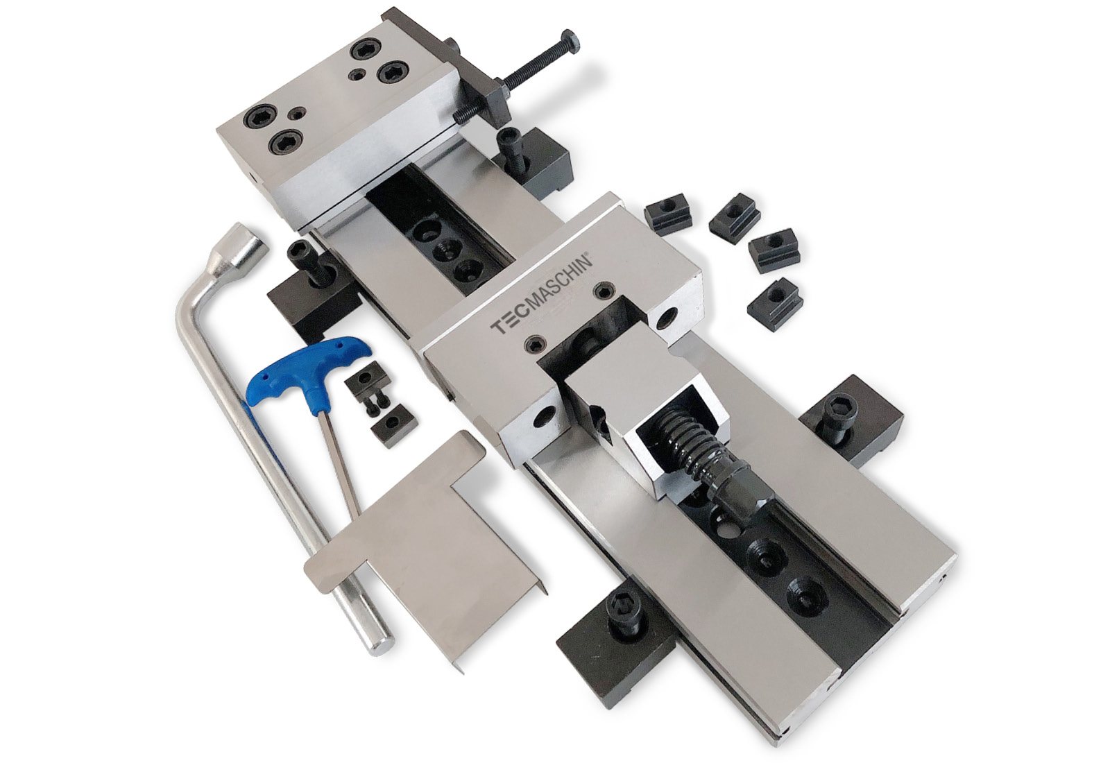 The MA-S200 machine vice from TecMaschin meets the highest standards for precision, even under heavy strain. It holds the workpiece firmly in place and keeps it from slipping even during machining work such as milling or drilling with a tolerance of 0,05 mm. This is made possible by the vice’s integrated pull-down system. The machine vice, with its compact dimensions of 150 mm x 420 mm x 100 mm, can be attached to CNC machines, workbenches, machining centres and other machine tools by means of clamping jaws/clamping claws. The vice can be easily adjusted and workpieces firmly clamped in place with the enclosed hex key.