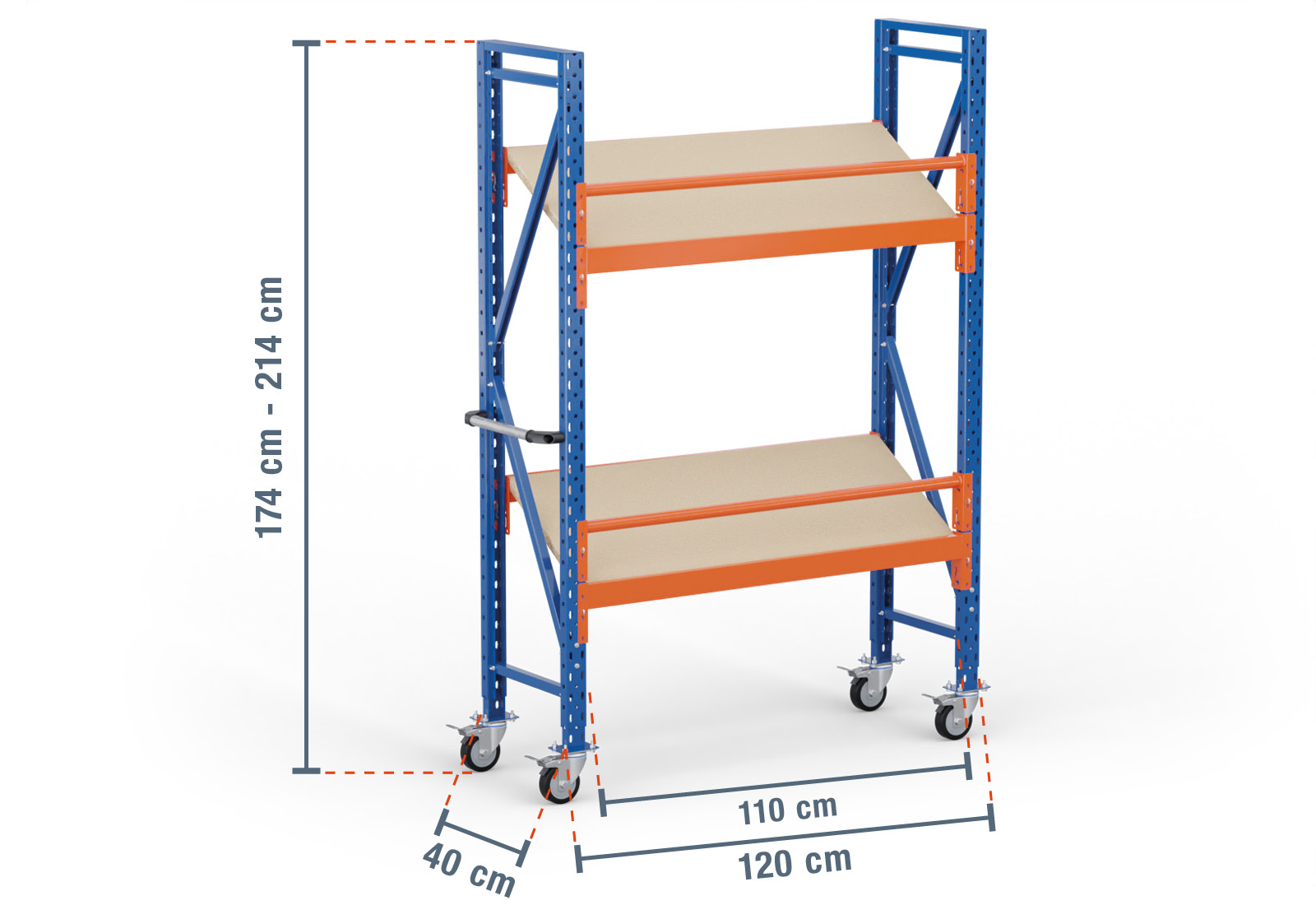 This mobile kanban rack from TOPREGAL comprises 2 levels, each of which is equipped with an angled wooden shelf. One level also has two stepped beams, which are the actual load-bearing elements, and a round beam used as fall protection. These beams are painted in orange and can be attached at individual increments of 50 mm. This improves the ergonomics of your rack and allows you to configure your compartments to be an optimal size.