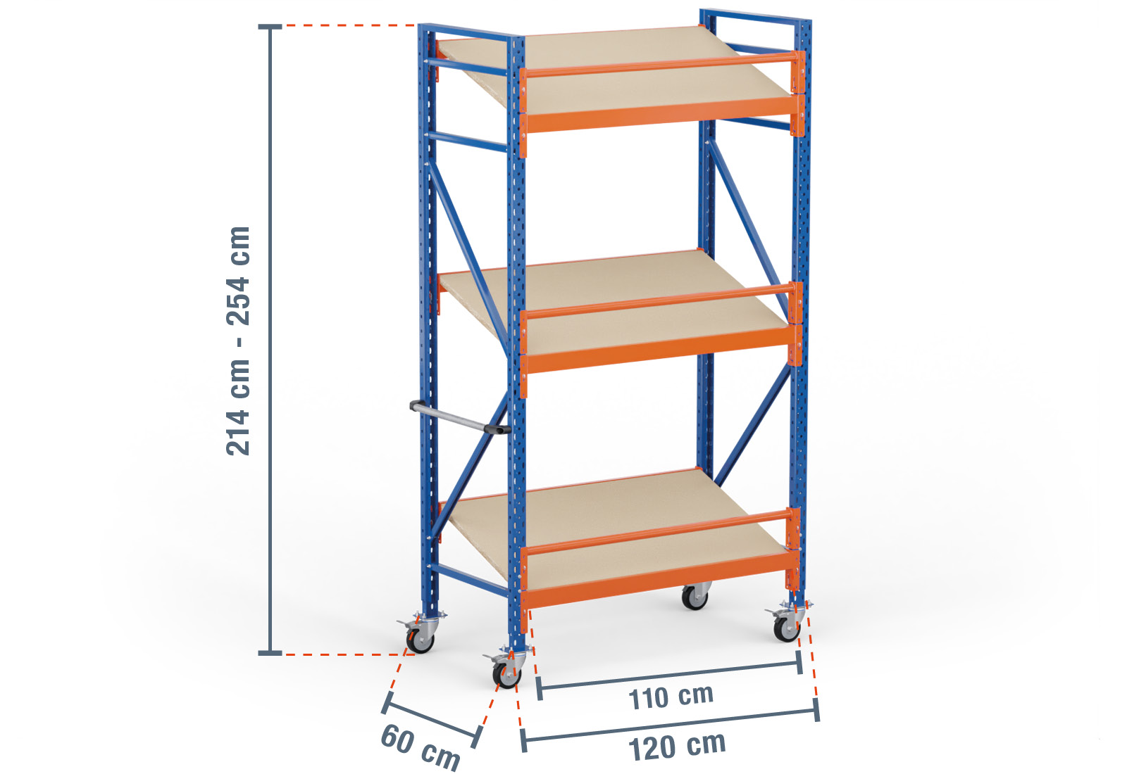 This mobile kanban rack from TOPREGAL comprises 3 levels, each of which is equipped with an angled wooden shelf. One level also has two stepped beams, which are the actual load-bearing elements, and a round beam used as fall protection. These beams are painted in orange and can be attached at individual increments of 50 mm. This improves the ergonomics of your rack and allows you to configure your compartments to be an optimal size.
