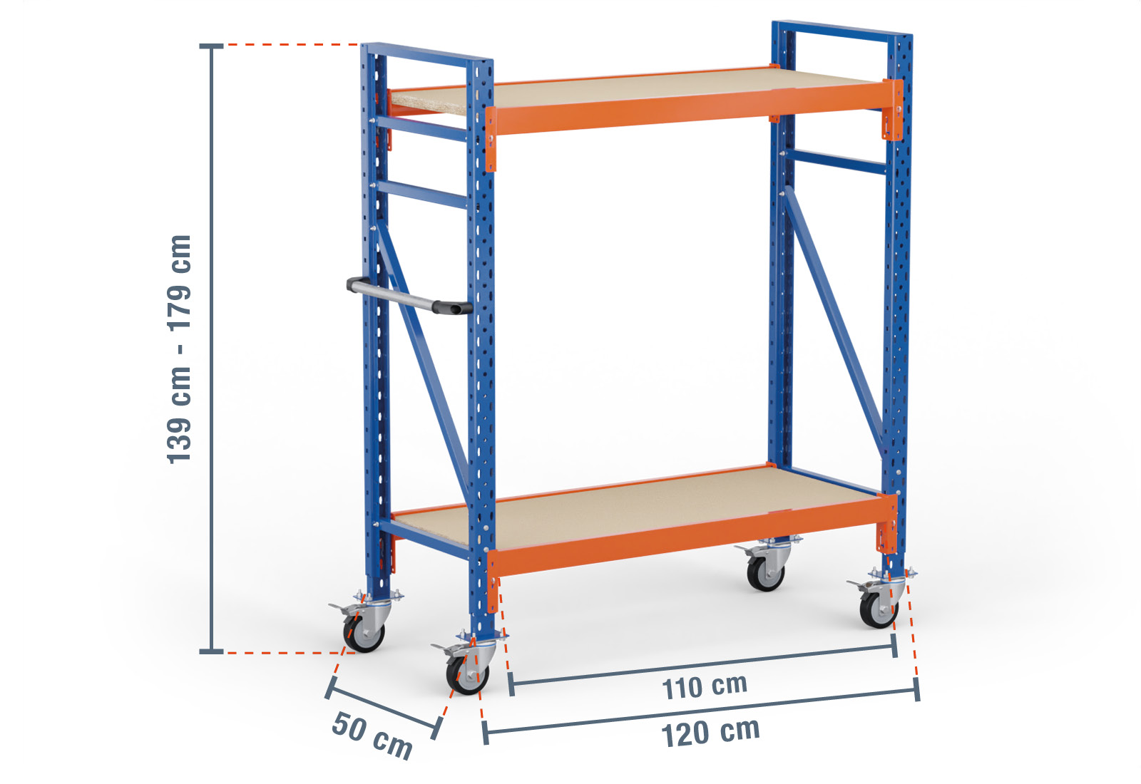 1,2 m mobile storage rack LR2000 / 50 cm deep / 1.390 - 1.790 mm high / 2 levels / rack layer Wood