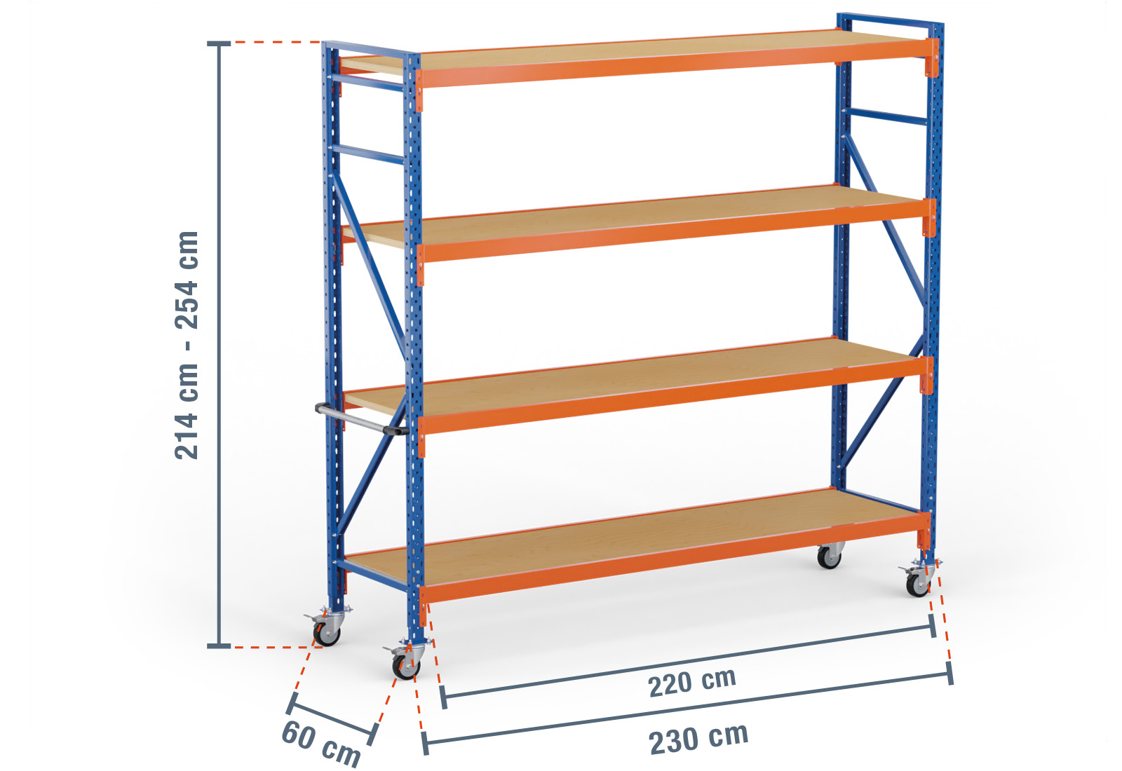 2,3 m mobile storage rack LR2000 / 60 cm deep / 2.140 - 2.540 mm high / 4 levels / rack layer Plywood