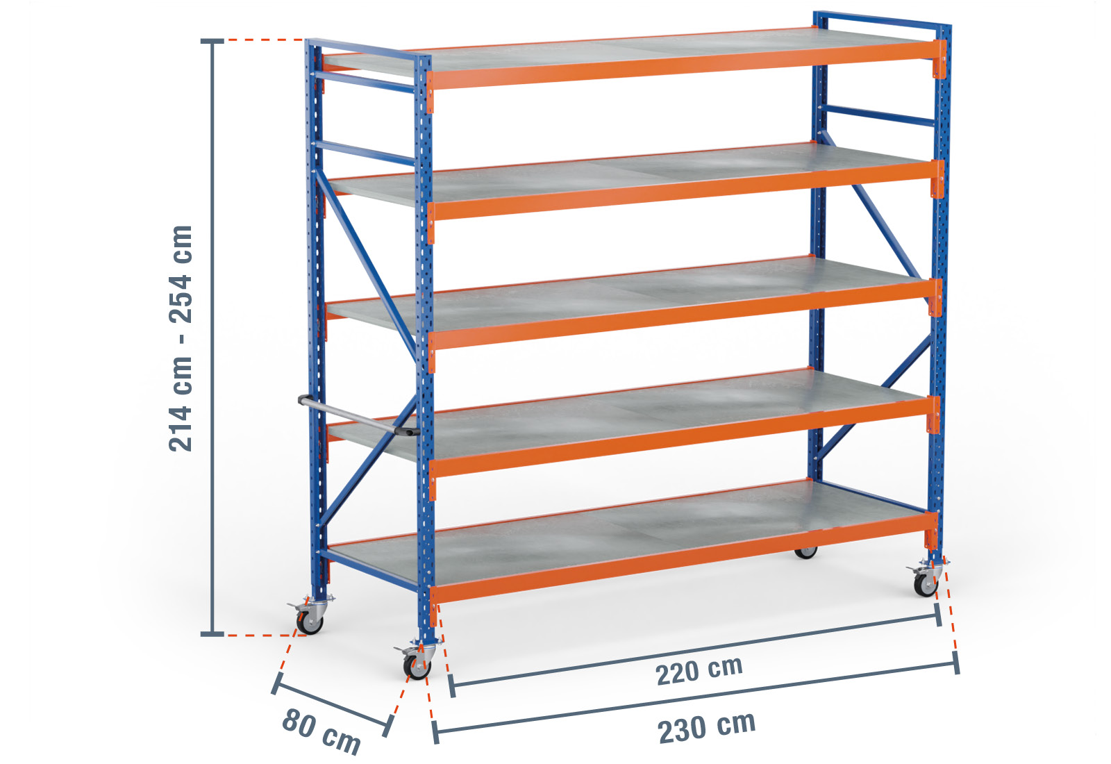 2,3 m mobile storage rack LR2000 / 80 cm deep / 2.140 - 2.540 mm high / 5 levels / rack layer Steel