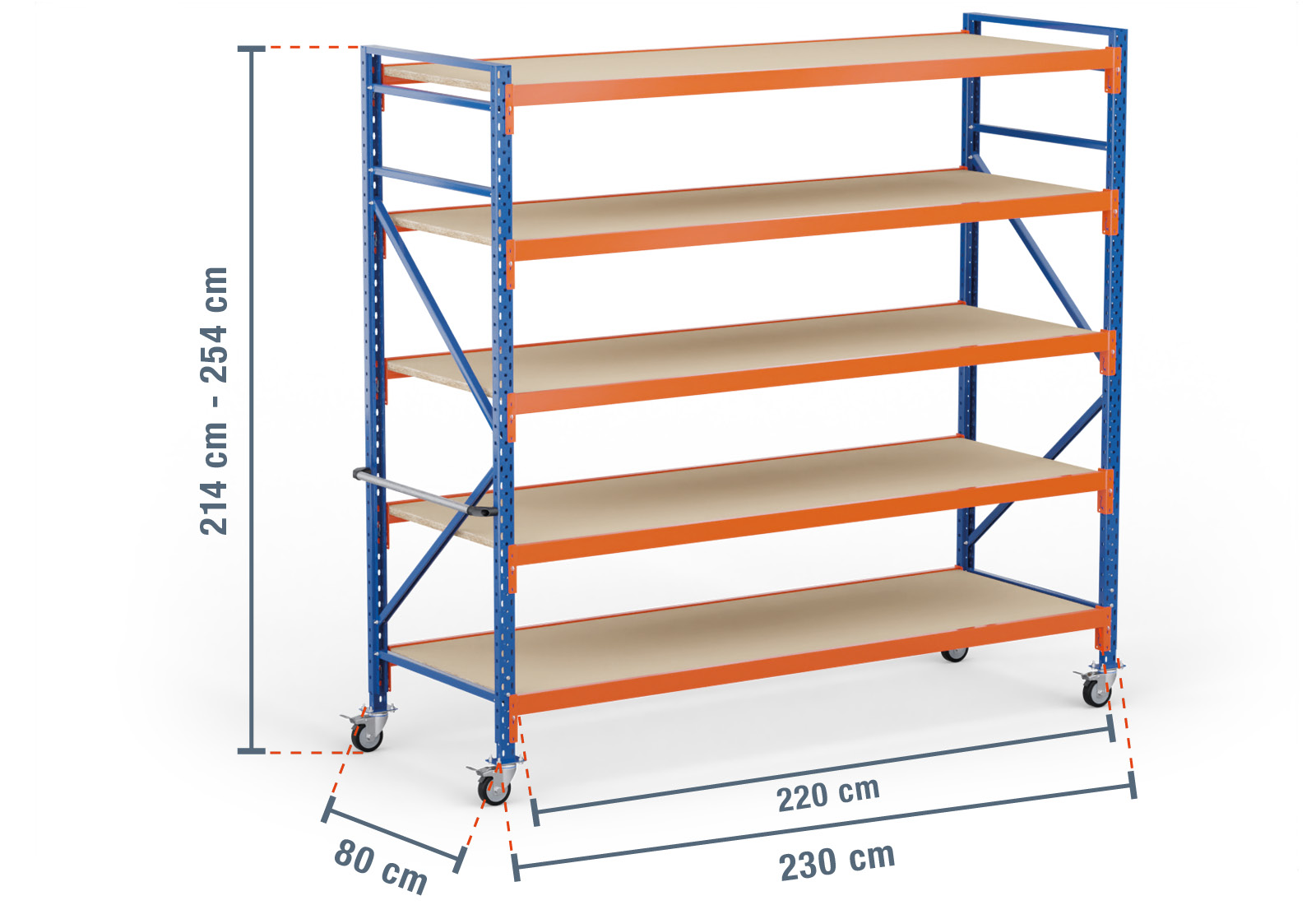 2,3 m mobile storage rack LR2000 / 80 cm deep / 2.140 - 2.540 mm high / 5 levels / rack layer Wood