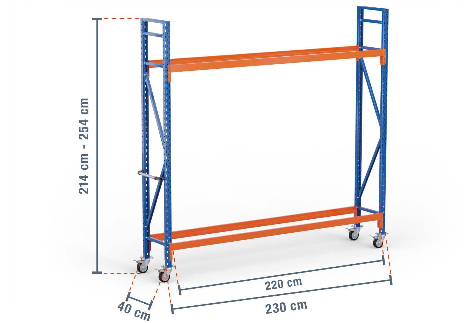 This fully configured mobile tyre rack with no rack layer is used for convenient transport of tyres, rims or similar items. The total width of this practical mobile rack is 2,3 m, though the effective contact area (usable inside dimension) is 10 cm shorter. This rack has 2 levels, where a 110-cm beam can be filled with 6 tyres or rims and a 220-cm beam can be filled with up to 12 tyres or rims.