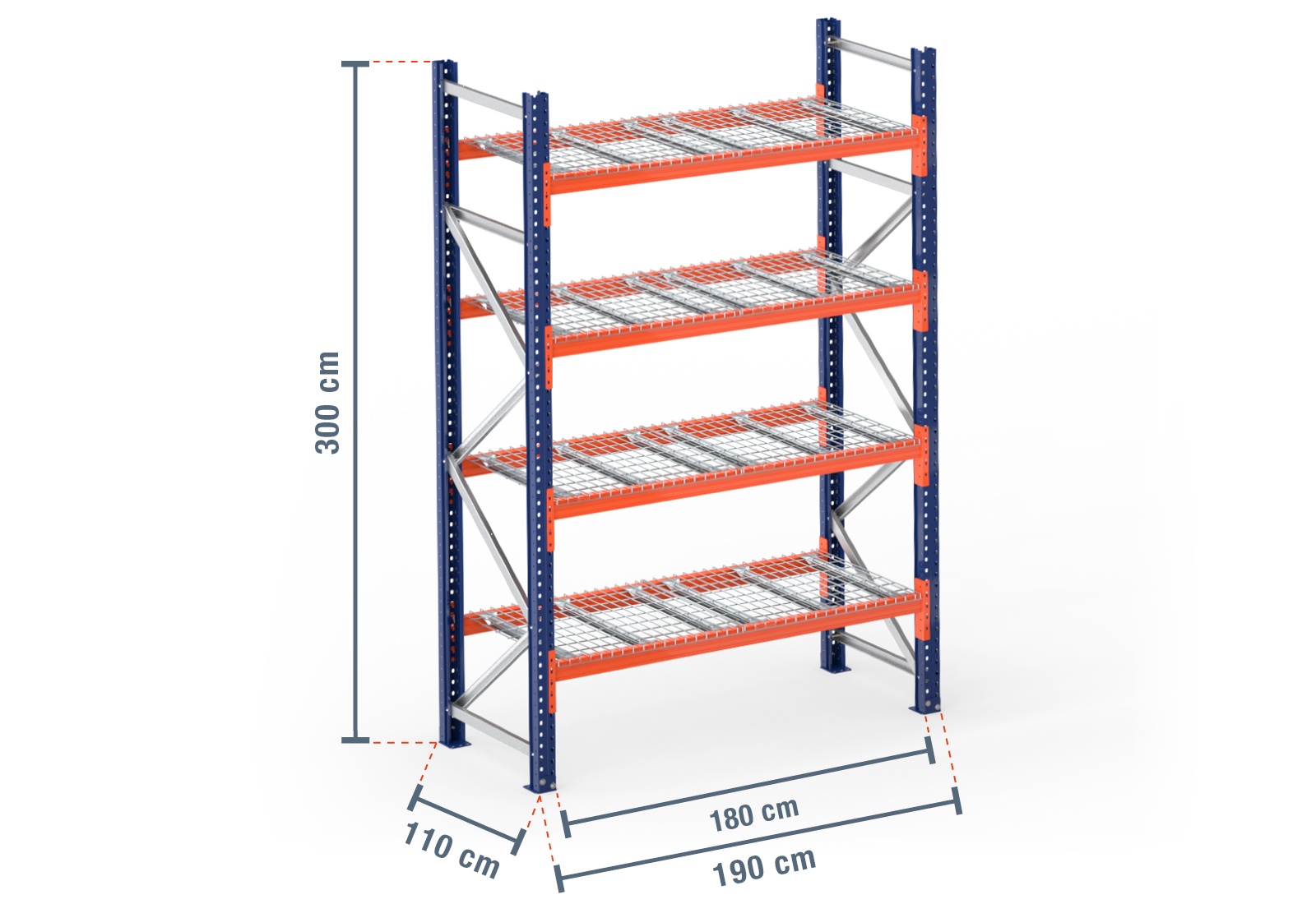 1,9 m pallet racking PR4500 / 110 cm deep / 3 m high / 4 levels / rack layer Wire mesh
