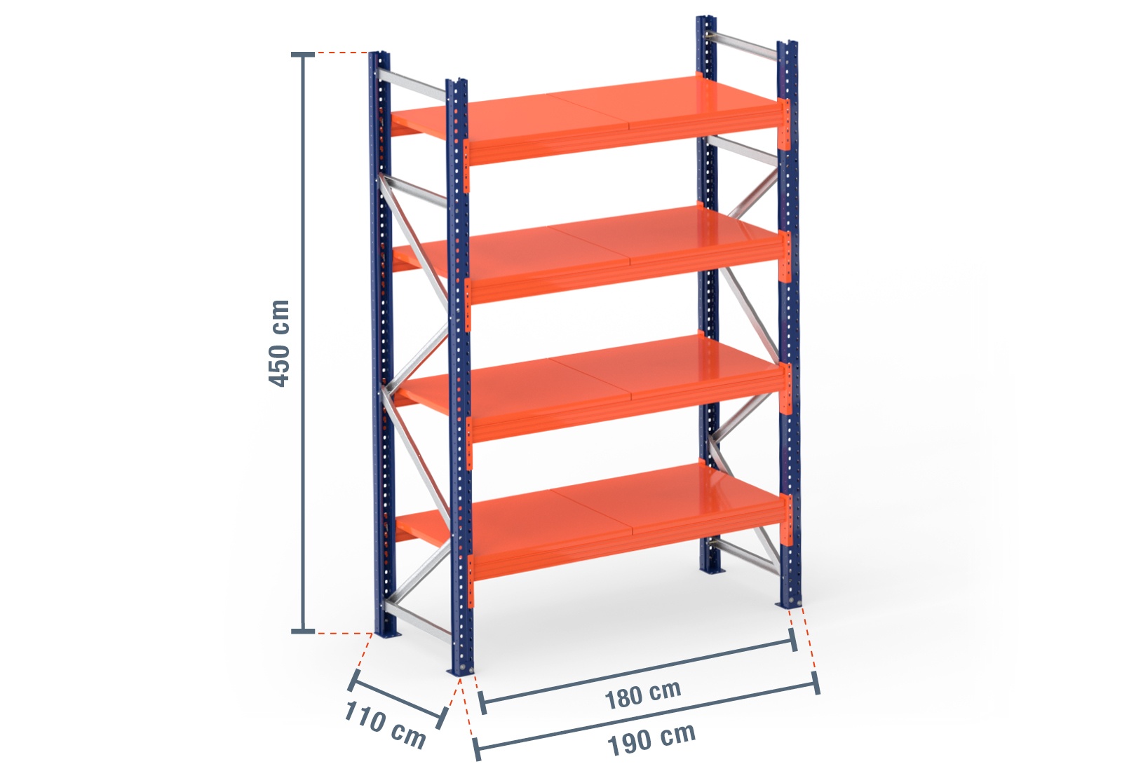 1,9 m pallet racking PR9000 / 110 cm deep / 4,5 m high / 4 levels / rack layer Steel