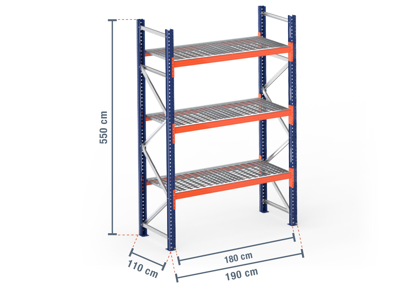 1,9 m pallet racking PR9000 / 110 cm deep / 5,5 m high / 3 levels / rack layer Galvanised mesh