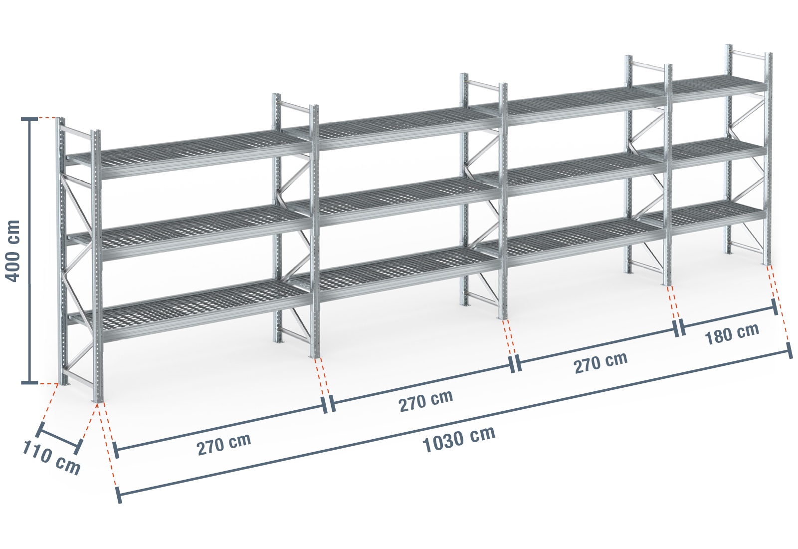 10,3 m pallet rack PR9000F galvanised / 110 cm deep / 4 m high / 3 levels / rack layer Galvanised mesh