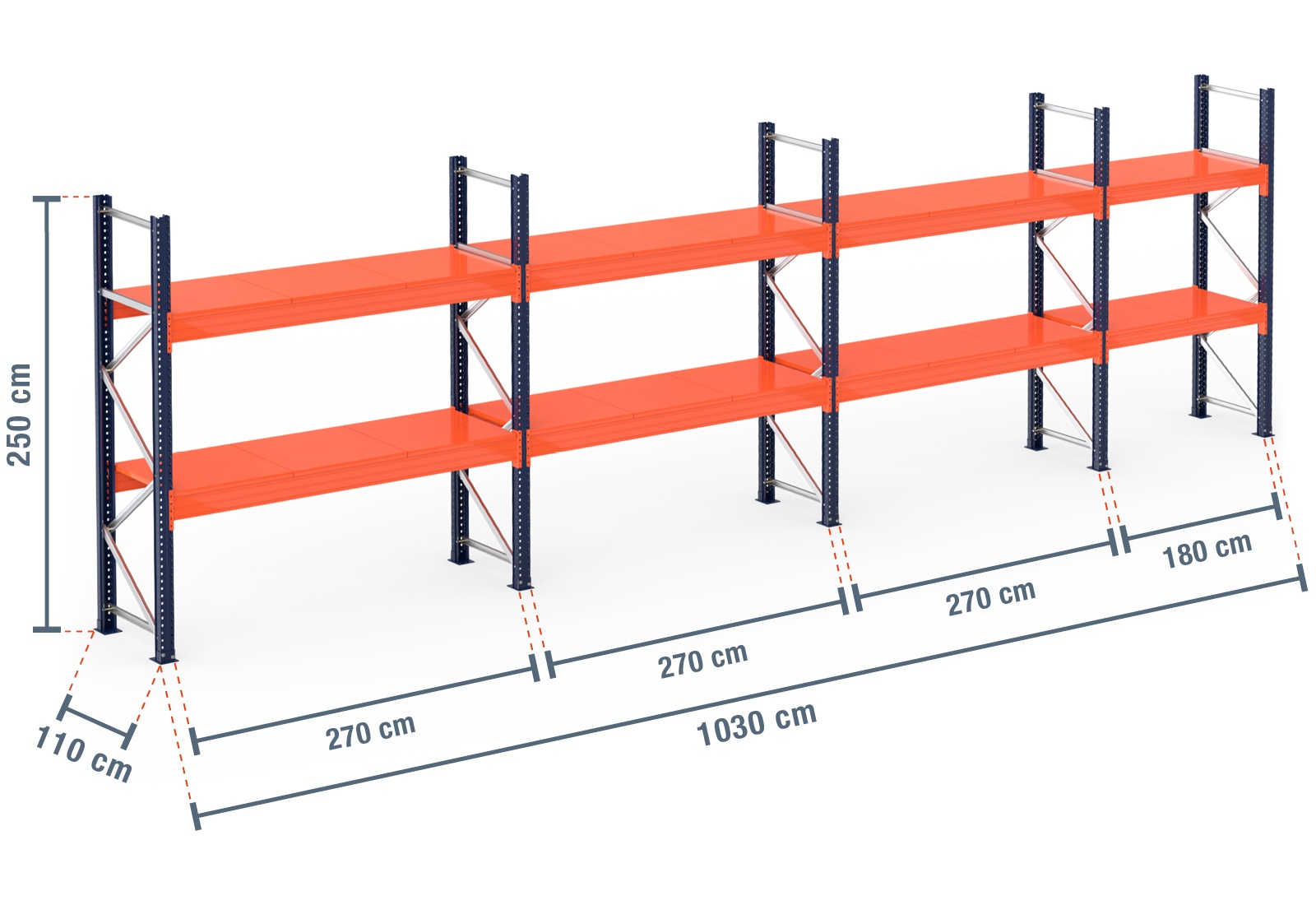 10,3 m pallet racking PR15000 / 110 cm deep / 2,5 m high / 2 levels / rack layer Steel