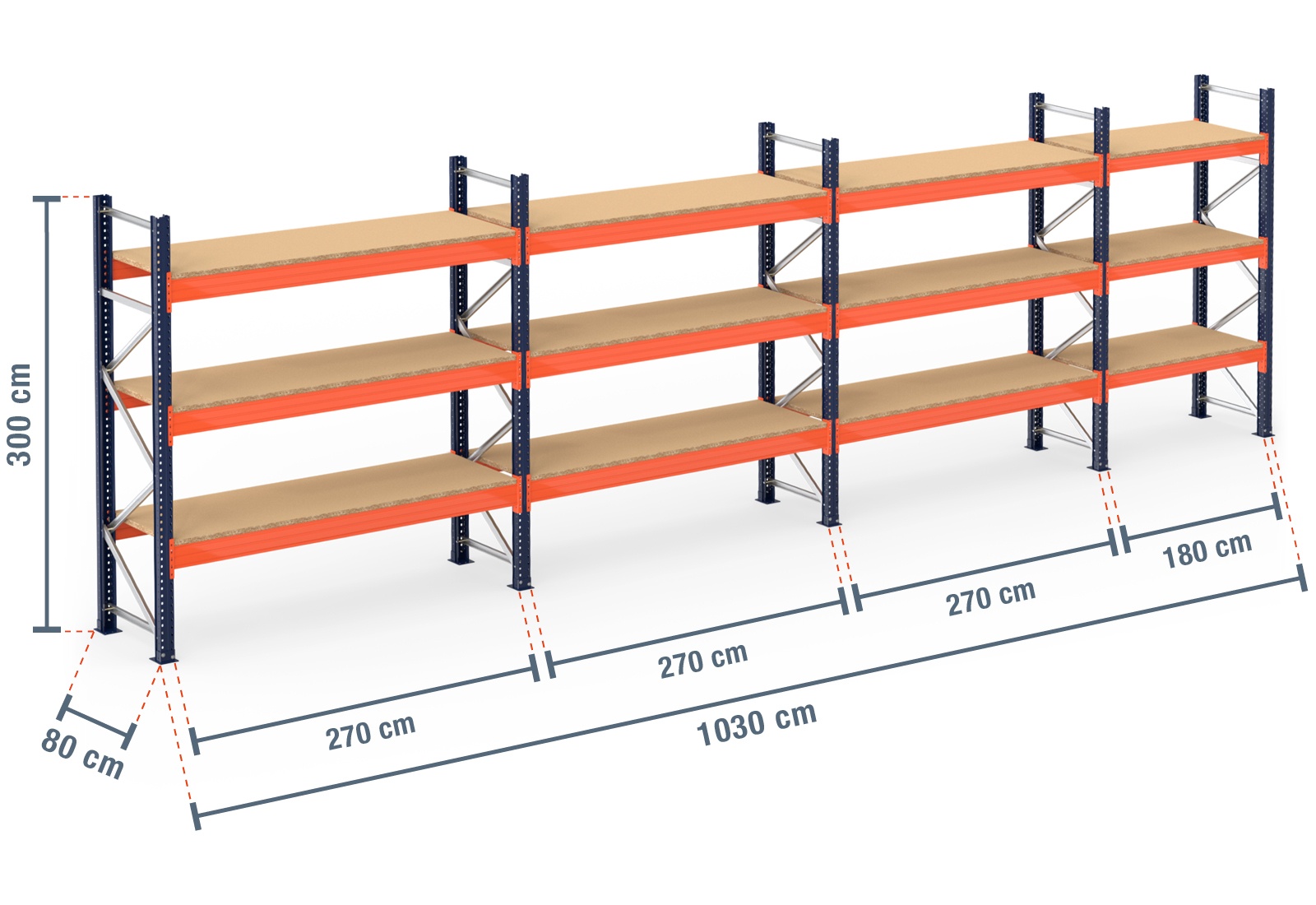 10,3 m pallet racking PR15000 / 80 cm deep / 3 m high / 3 levels / rack layer Wood