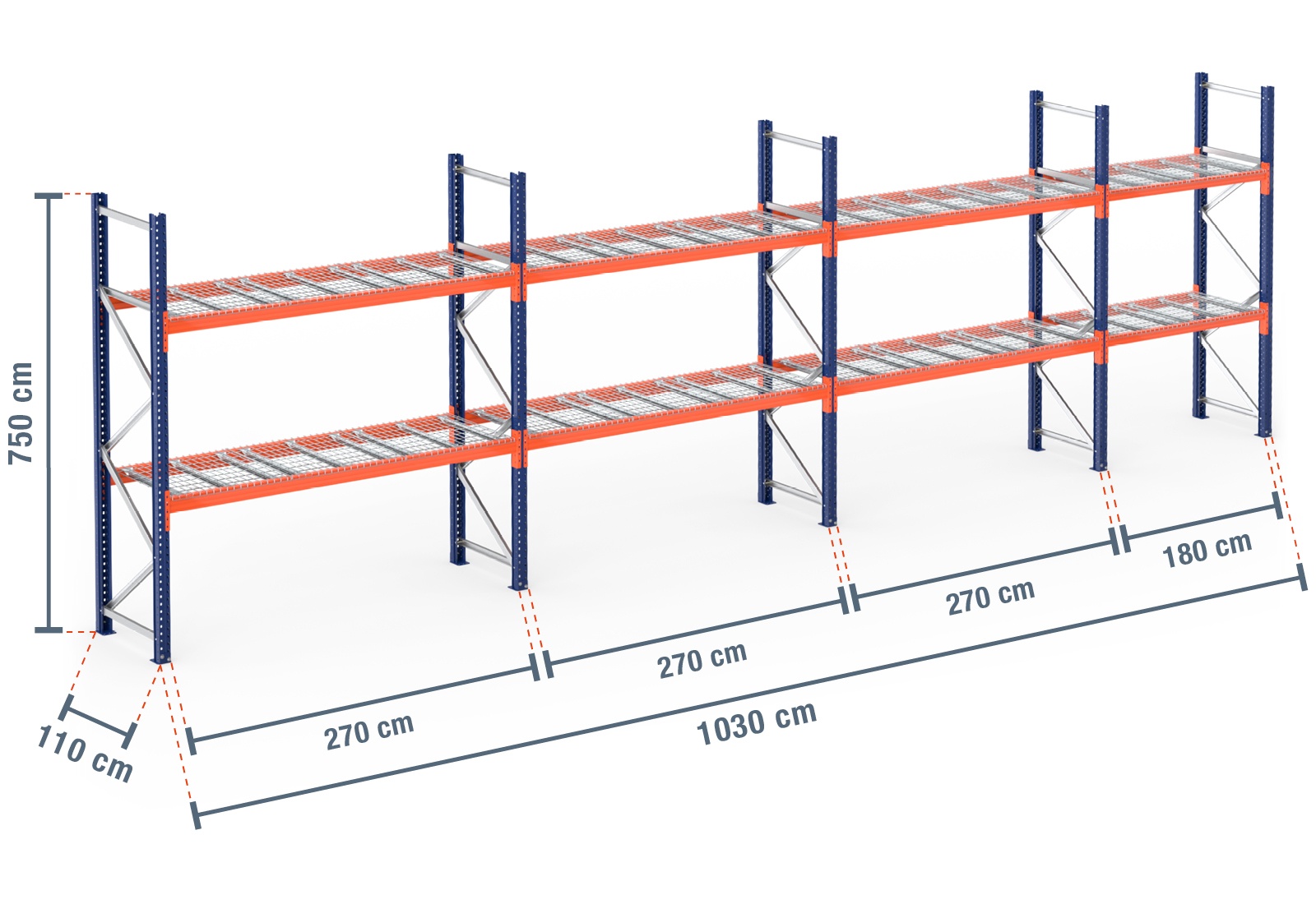 10,3 m pallet racking PR9000 / 110 cm deep / 7,5 m high / 2 levels / rack layer Wire mesh