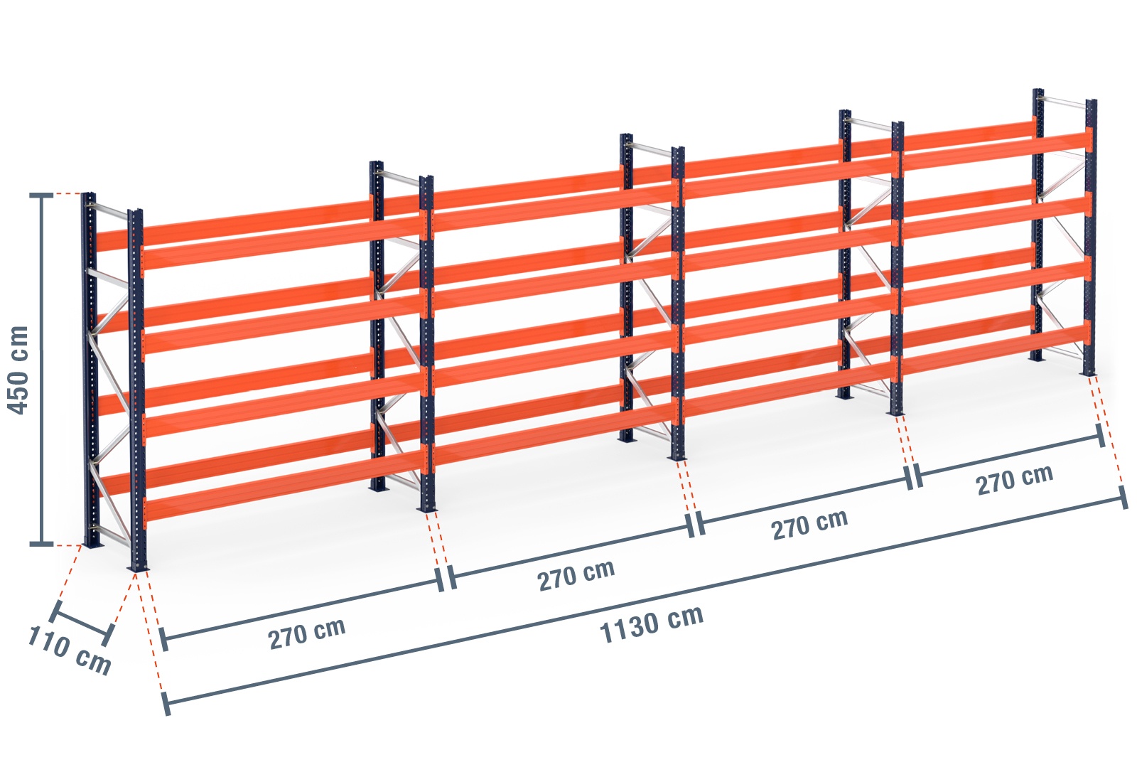 11,3 m pallet rack PR15000 / 110 cm deep / 4,5 m high / 4 levels for 60 euro pallets