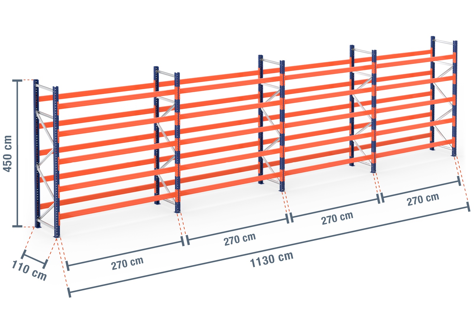 11,3 m pallet rack PR4500 / 110 cm deep / 4,5 m high / 5 levels for 72 euro pallets