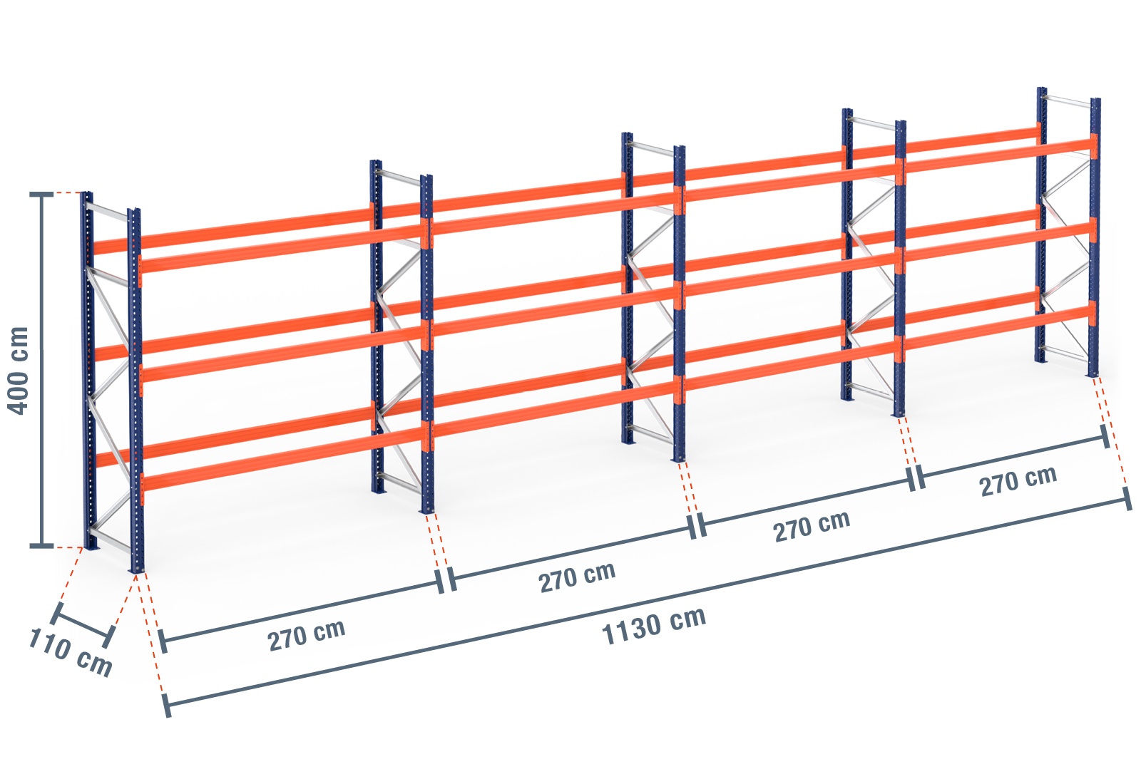 11,3 m pallet rack PR9000 / 110 cm deep / 4 m high / 3 levels for 48 euro pallets