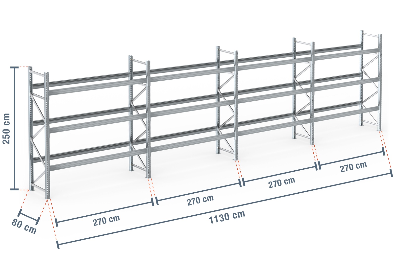 11,3 m pallet rack PR9000F galvanised / 80 cm deep / 2,5 m high / 3 levels for 48 euro pallets