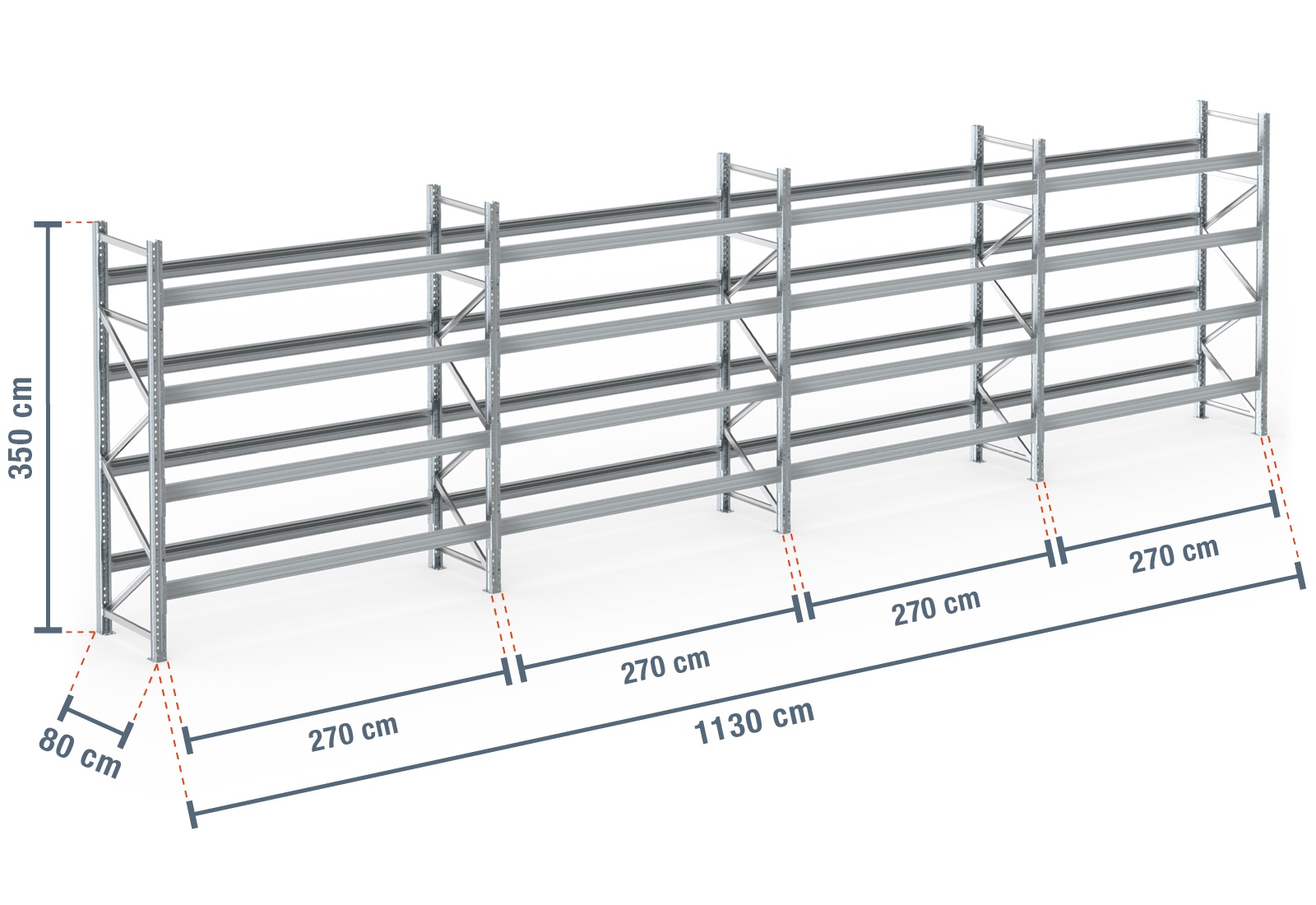 11,3 m pallet rack PR9000F galvanised / 80 cm deep / 3,5 m high / 4 levels for 60 euro pallets