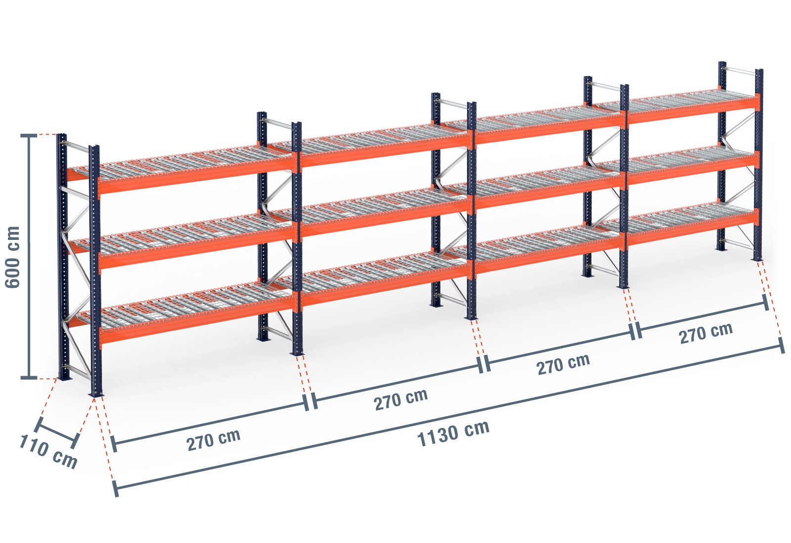 11,3 m pallet racking PR15000 / 110 cm deep / 6 m high / 3 levels / rack layer Wire mesh