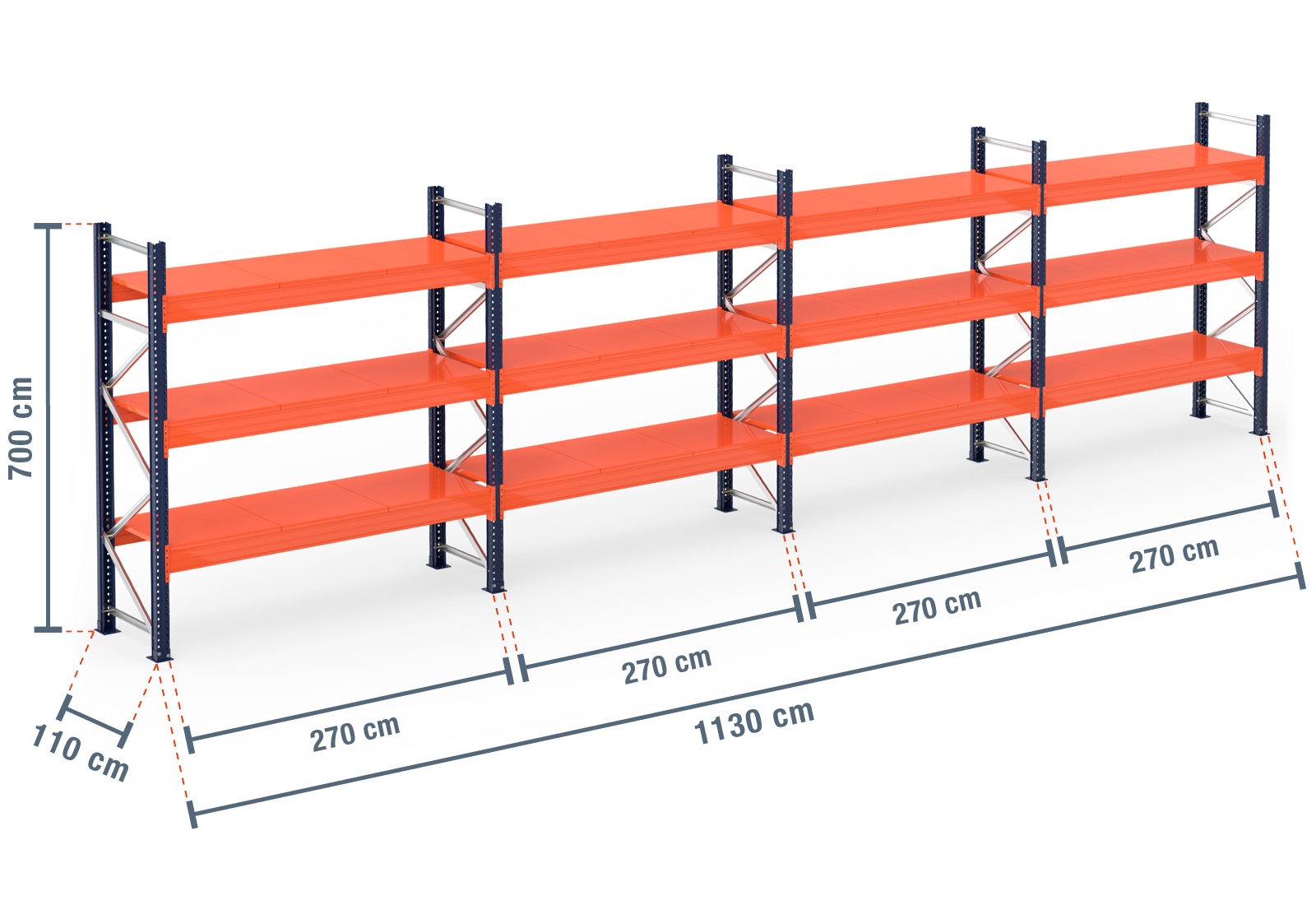 11,3 m pallet racking PR15000 / 110 cm deep / 7 m high / 3 levels / rack layer Steel