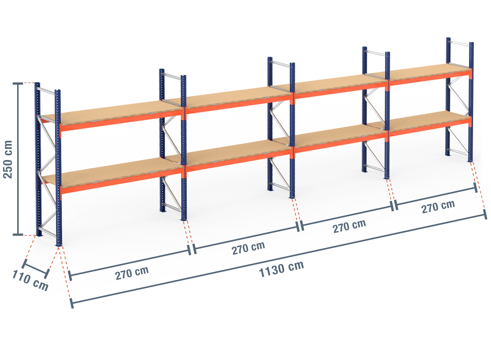 11,3 m pallet racking PR9000 / 110 cm deep / 2,5 m high / 2 levels / rack layer Wood
