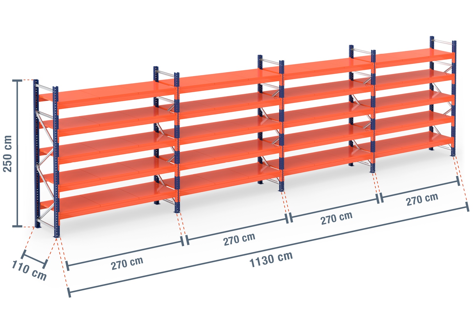 11,3 m pallet racking PR9000 / 110 cm deep / 2,5 m high / 5 levels / rack layer Steel