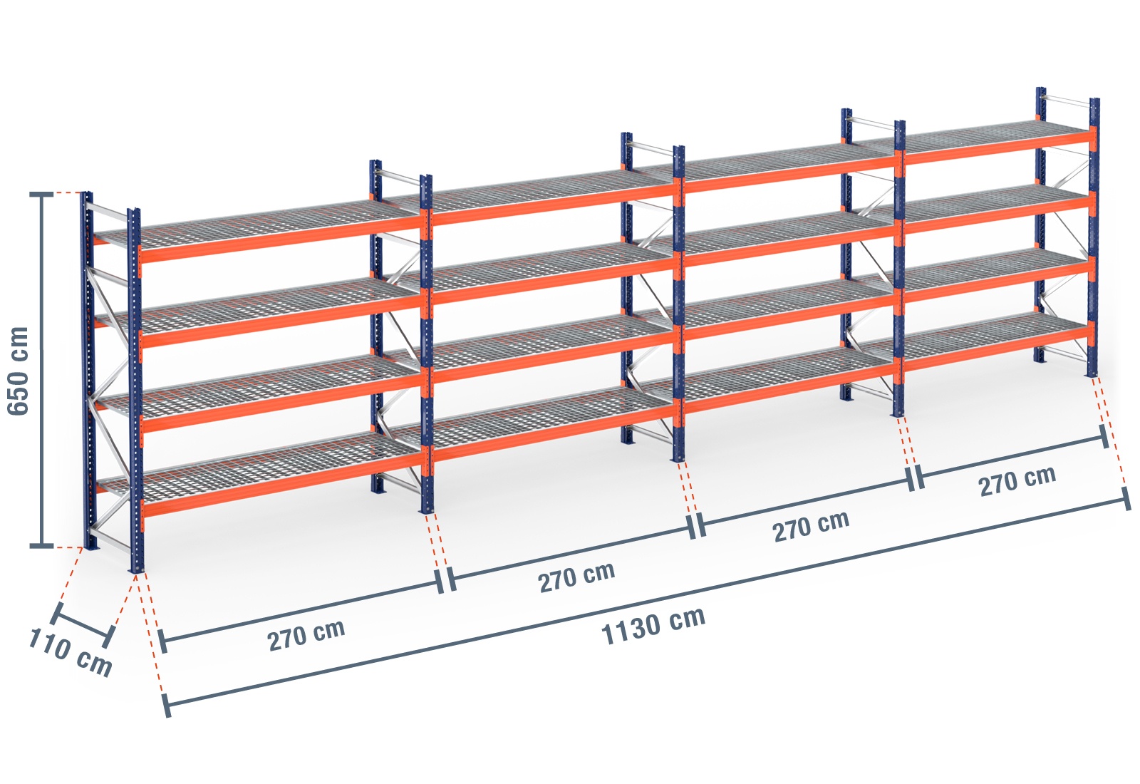 11,3 m pallet racking PR9000 / 110 cm deep / 6,5 m high / 4 levels / rack layer Galvanised mesh