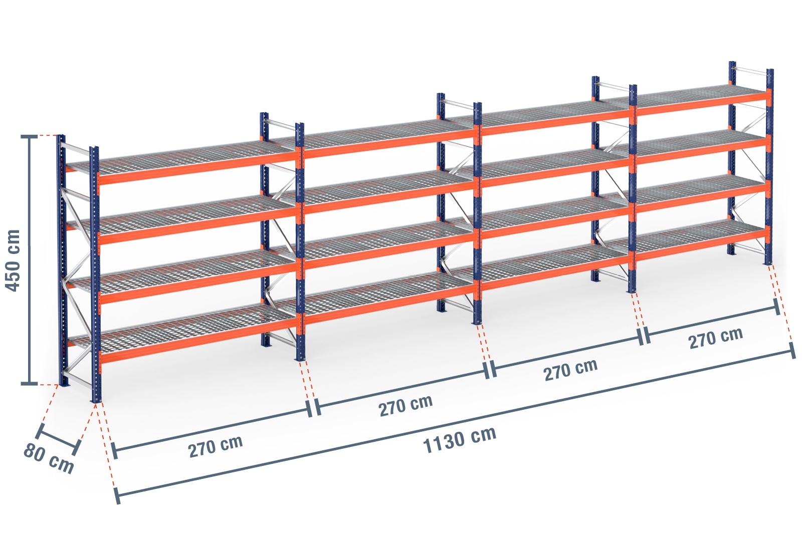 11,3 m pallet racking PR9000 / 80 cm deep / 4,5 m high / 4 levels / rack layer Galvanised mesh