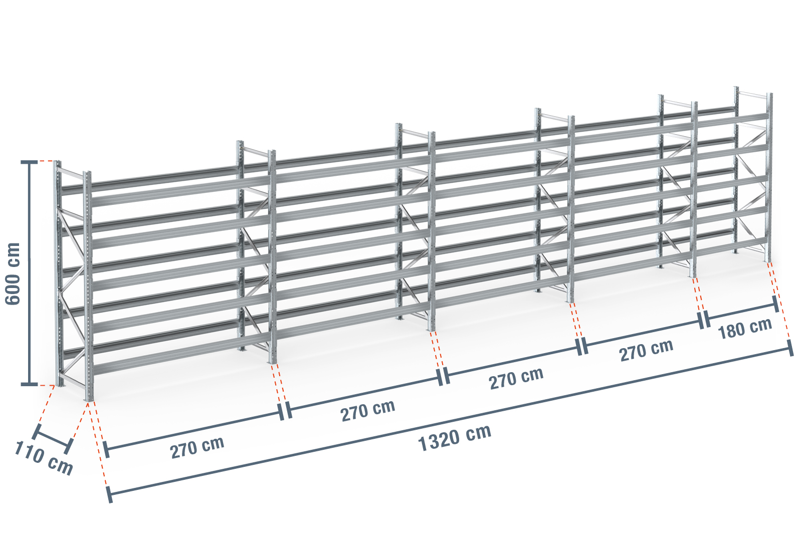 - 6 x upright PR9000F 6 m high / 110 cm deep incl. strutting, unit load capacity: 9.000 kg