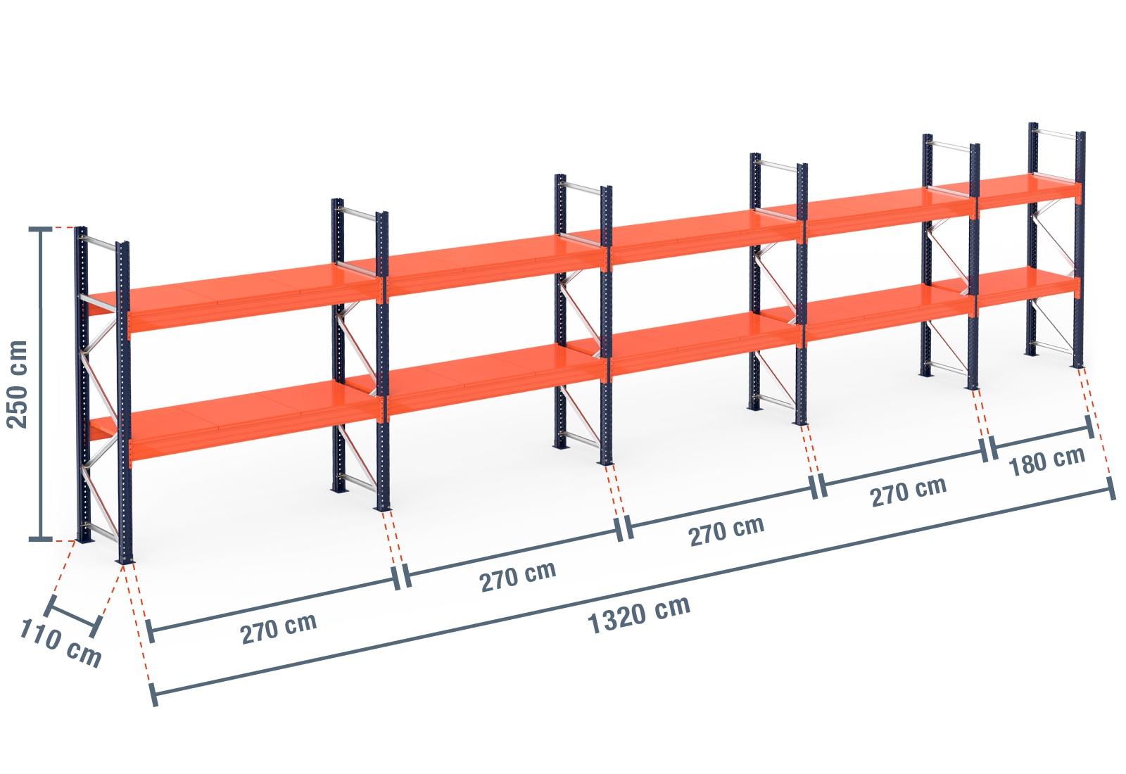 13,2 m pallet racking PR15000 / 110 cm deep / 2,5 m high / 2 levels / rack layer Steel