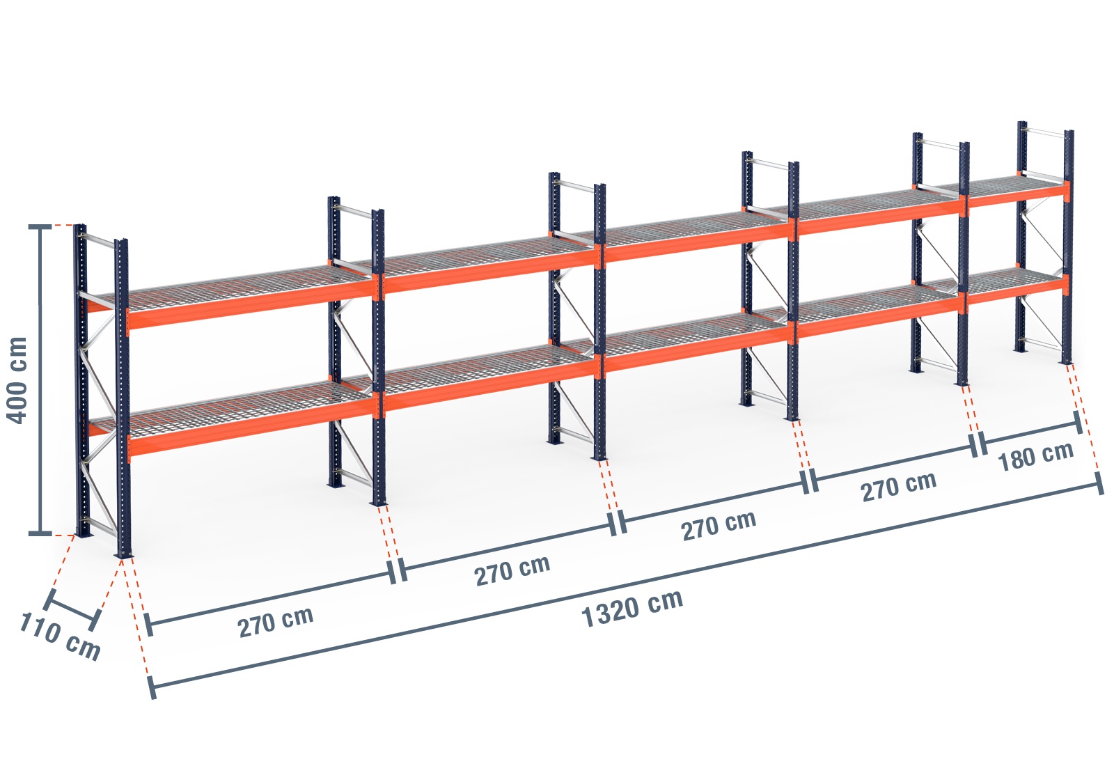 13,2 m pallet racking PR15000 / 110 cm deep / 4 m high / 2 levels / rack layer Galvanised mesh