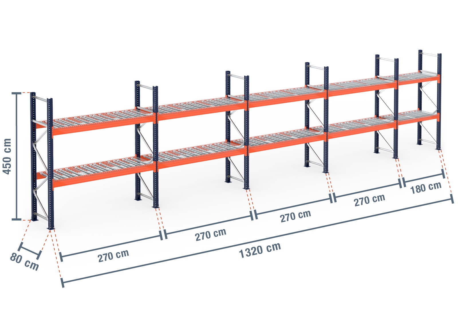 13,2 m pallet racking PR15000 / 80 cm deep / 4,5 m high / 2 levels / rack layer Wire mesh