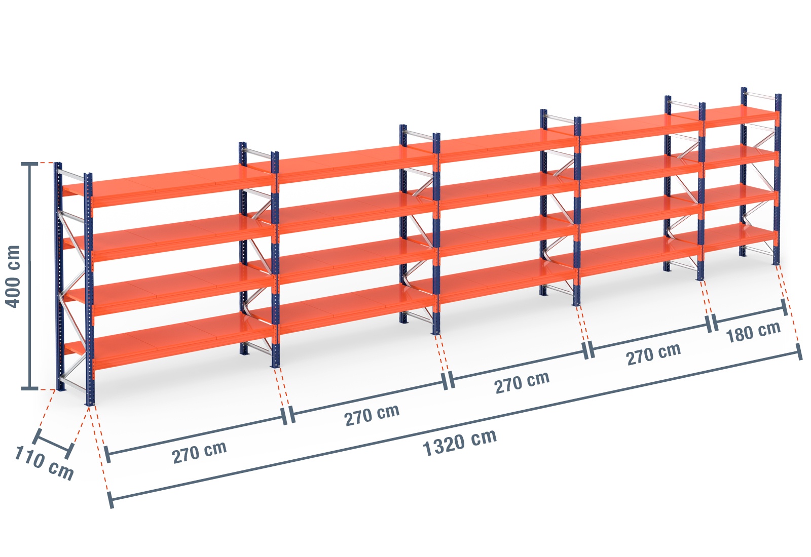 13,2 m pallet racking PR9000 / 110 cm deep / 4 m high / 4 levels / rack layer Steel