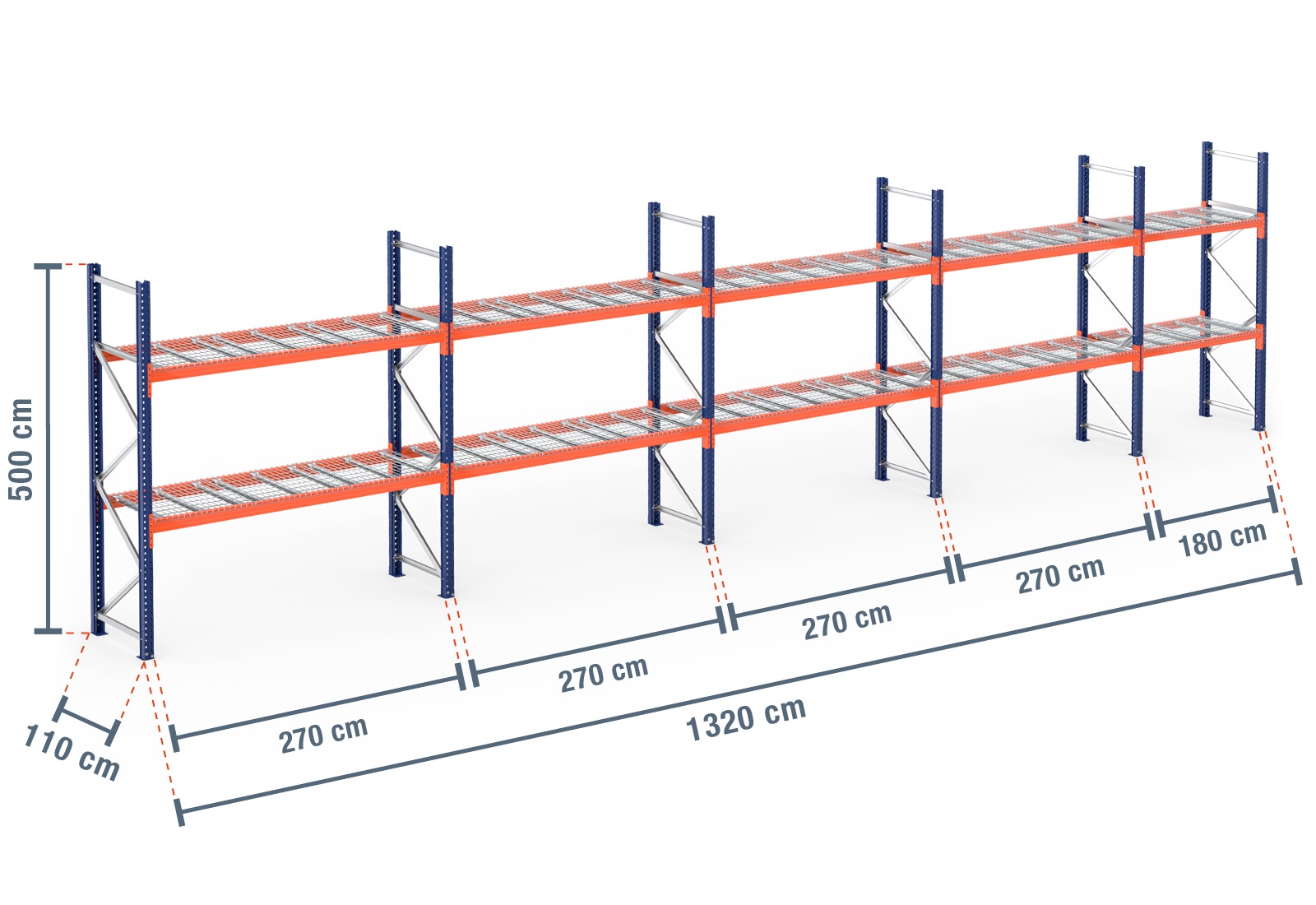 13,2 m pallet racking PR9000 / 110 cm deep / 5 m high / 2 levels / rack layer Wire mesh