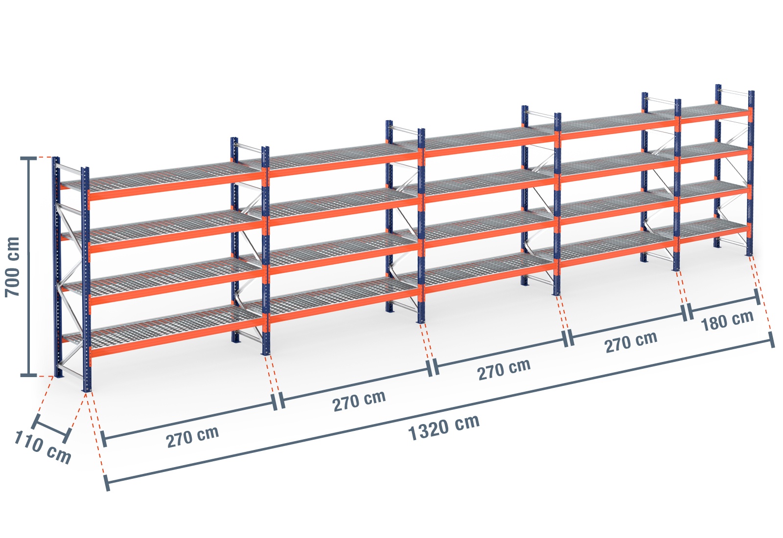 13,2 m pallet racking PR9000 / 110 cm deep / 7 m high / 4 levels / rack layer Galvanised mesh