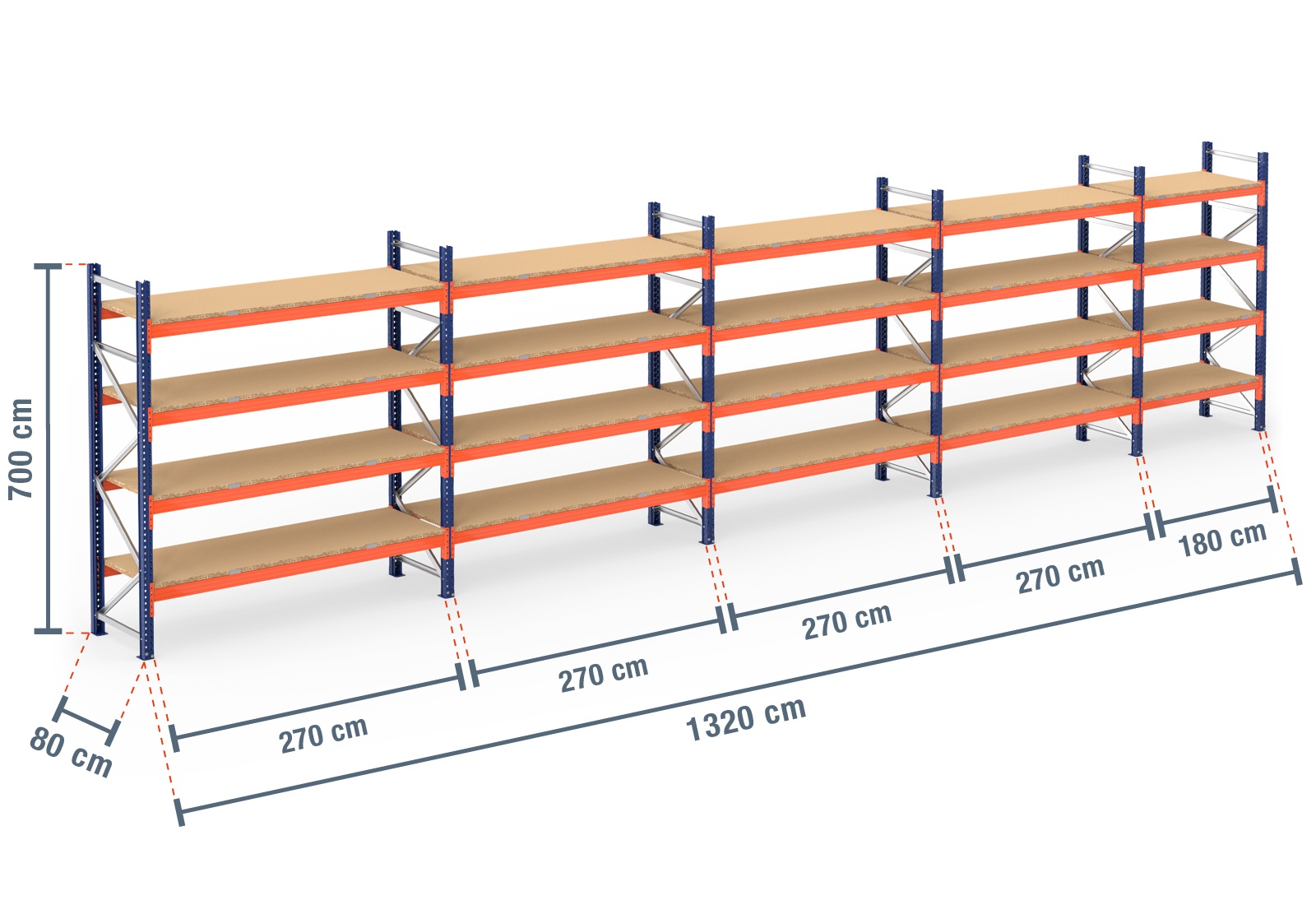 13,2 m pallet racking PR9000 / 80 cm deep / 7 m high / 4 levels / rack layer Wood