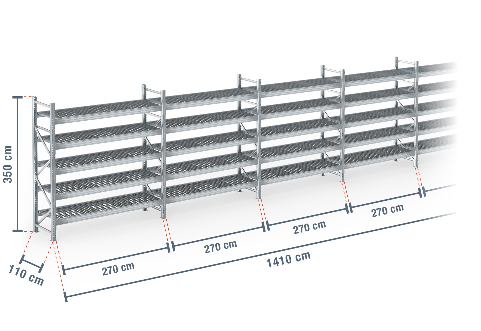 14,1 m pallet rack PR9000F galvanised / 110 cm deep / 3,5 m high / 5 levels / rack layer Galvanised mesh