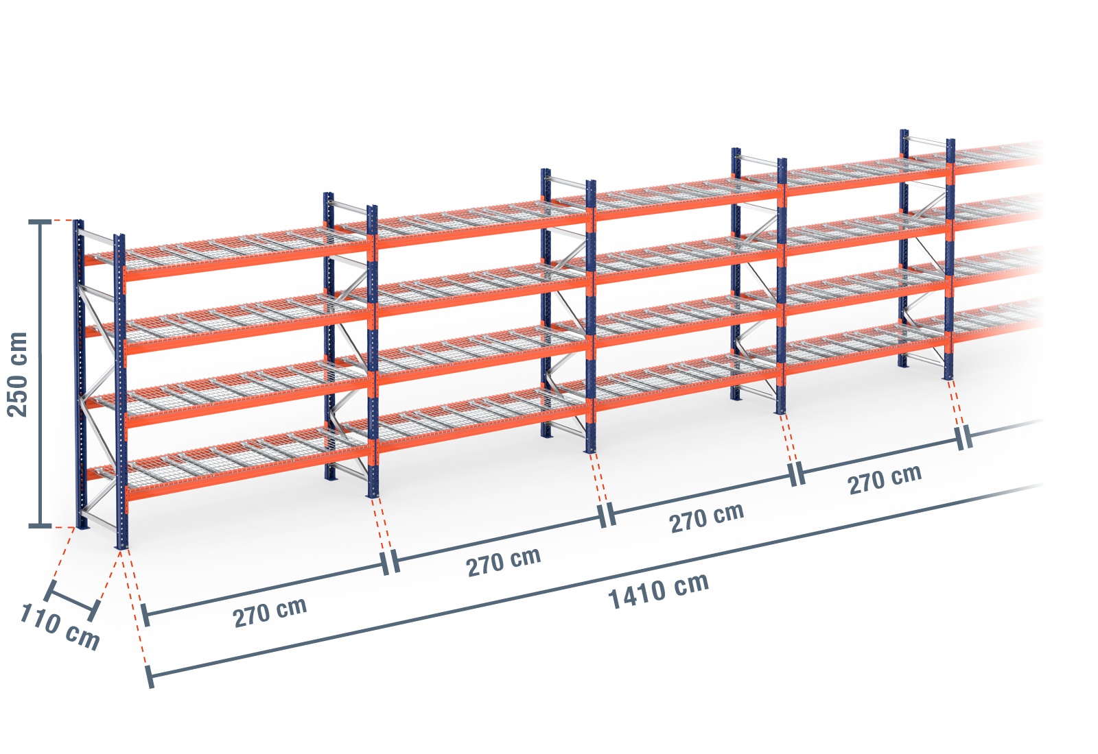14,1 m pallet racking PR9000 / 110 cm deep / 2,5 m high / 4 levels / rack layer Wire mesh