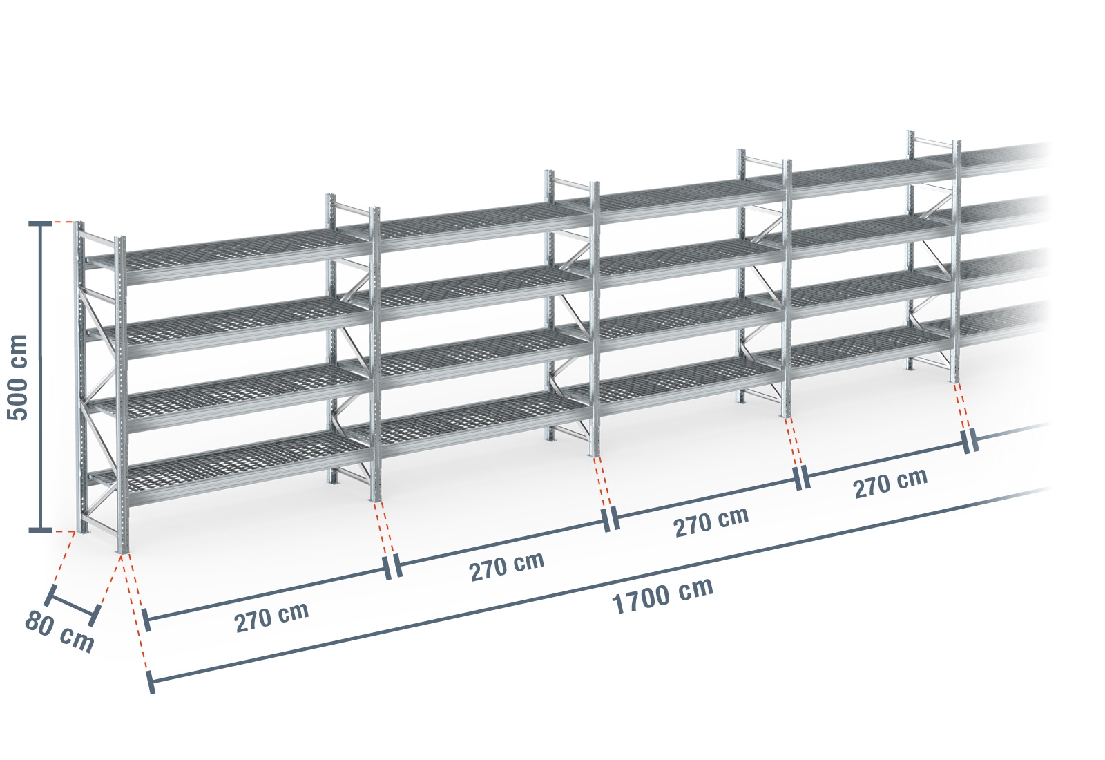 17 m pallet rack PR9000F galvanised / 80 cm deep / 5 m high / 4 levels / rack layer Galvanised mesh