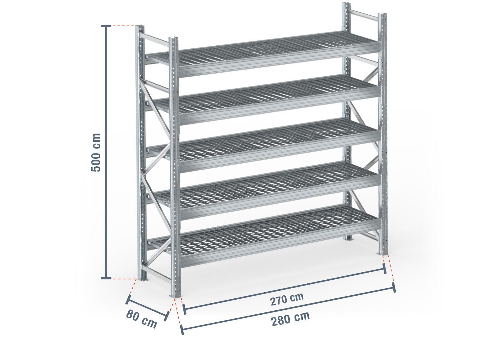 2,8 m pallet rack PR9000F galvanised / 80 cm deep / 5 m high / 5 levels / rack layer Galvanised mesh