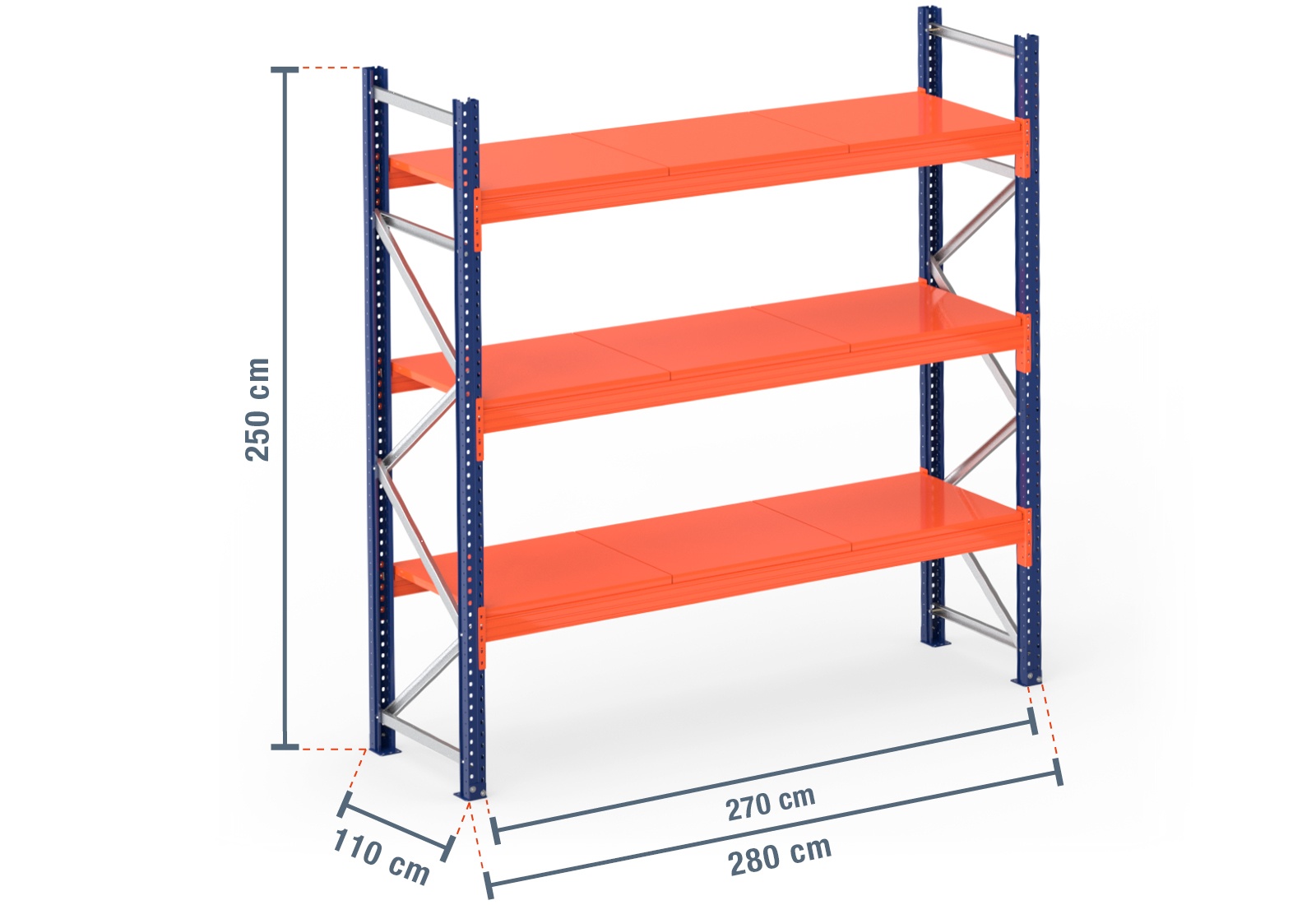 The steel shelf support is extremely durable and robust when compared with wooden boards or mesh shelves. These shelf supports have a long service life and are particularly suitable for the storage of liquids such as paint, oil or fuel. The steel shelf offers a maximum load capacity of 1.000 kg per module with an even weight distribution. It is also painted in the bright signal colour of orange. This ensures safety as the shelves can be easily seen from a distance. Its special design enables the steel shelf to be secured to the beams themselves, so it simply needs to be placed in position. When loading your pallet rack, please observe the maximum shelf and unit loads specified.