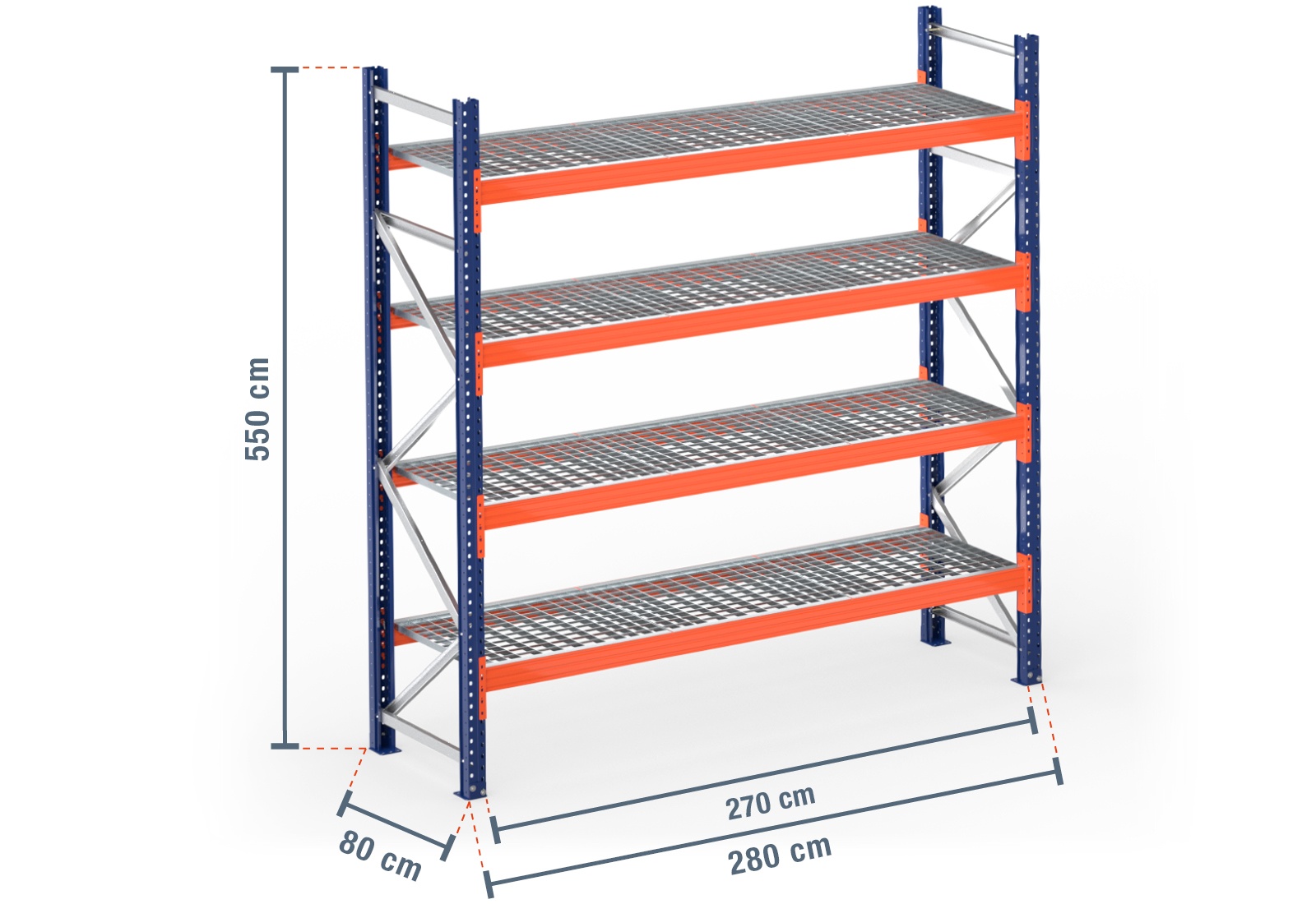 2,8 m pallet racking PR9000 / 80 cm deep / 5,5 m high / 4 levels / rack layer Galvanised mesh