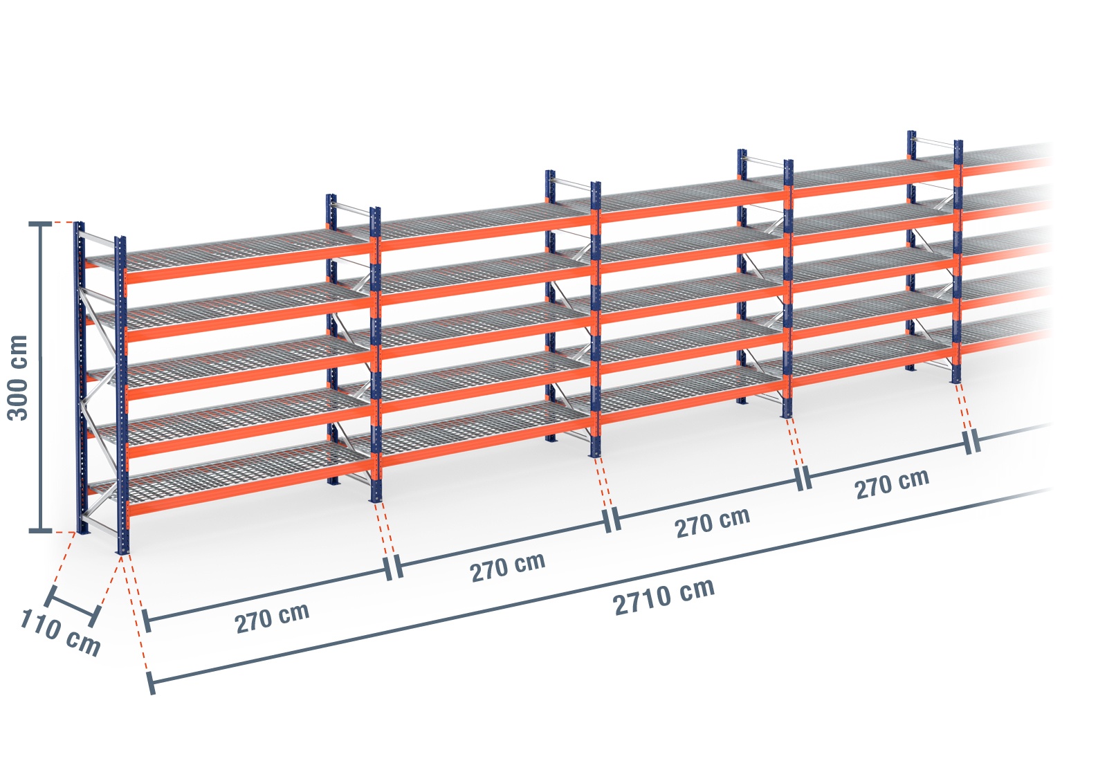 27,1 m pallet rack PR4500 / 110 cm deep / 3 m high / 5 levels / shelf Galvanised mesh