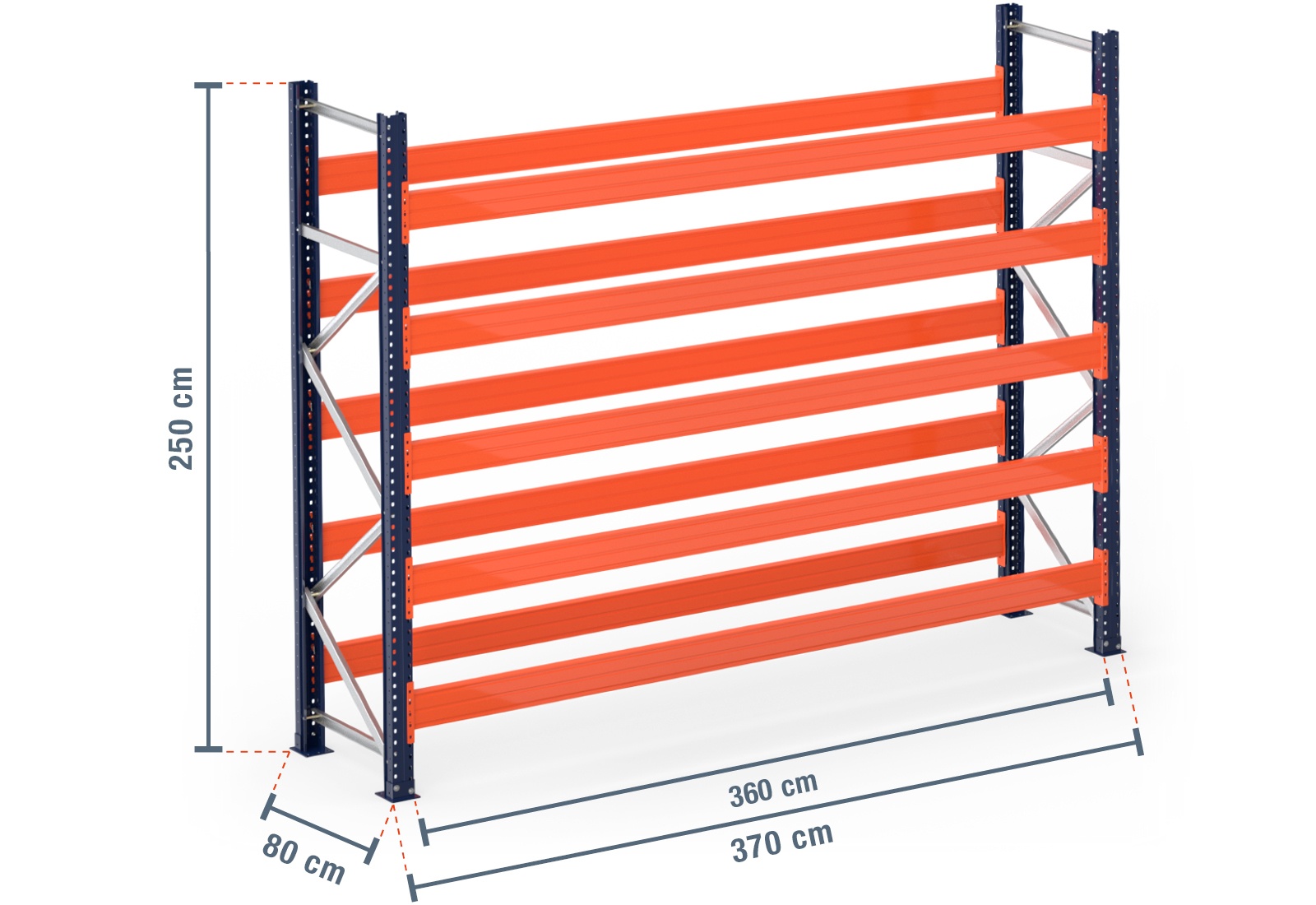 3,7 m pallet rack PR15000 / 80 cm deep / 2,5 m high / 5 levels for 26 euro pallets