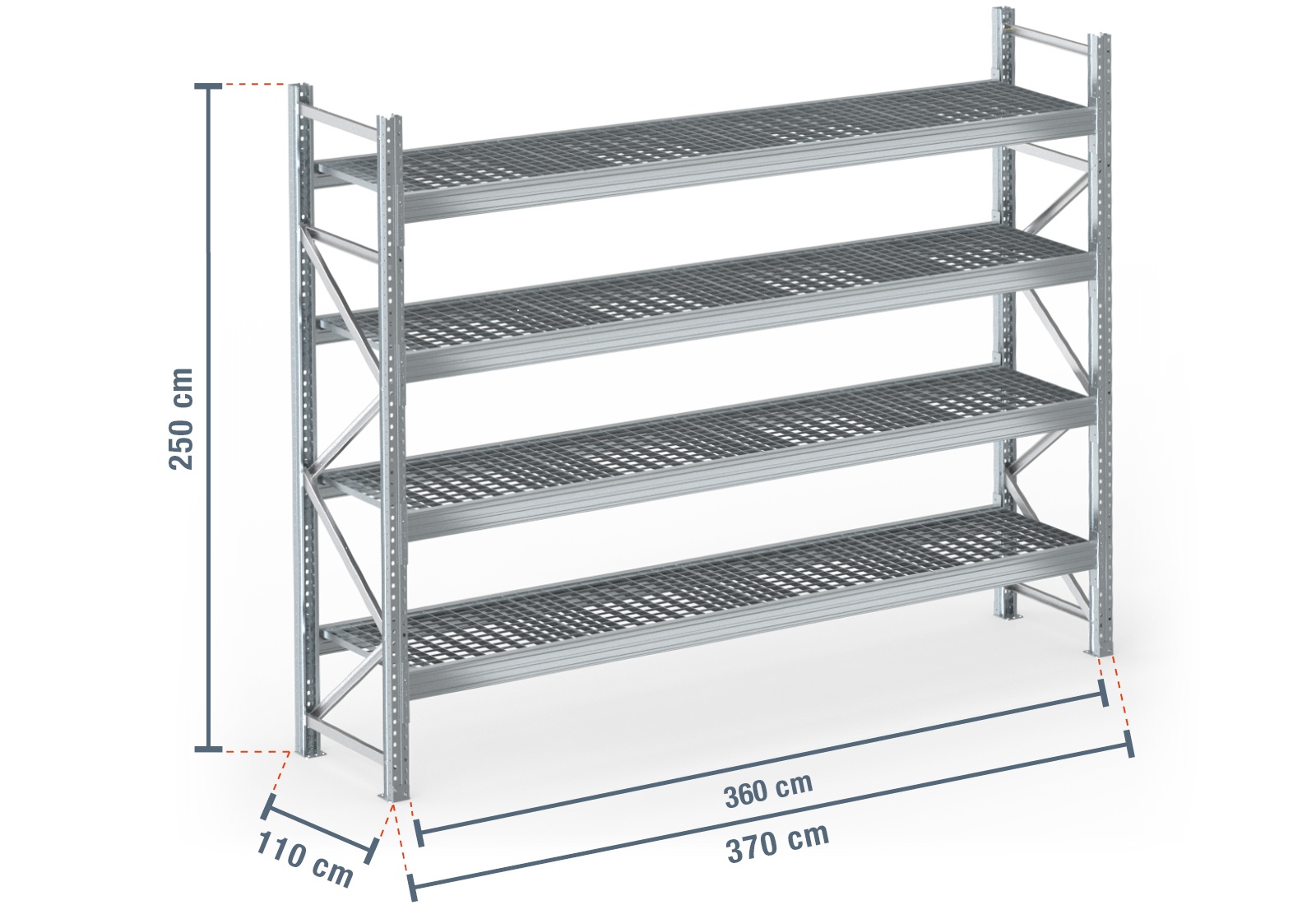 3,7 m pallet rack PR9000F galvanised / 110 cm deep / 2,5 m high / 4 levels / rack layer Galvanised mesh
