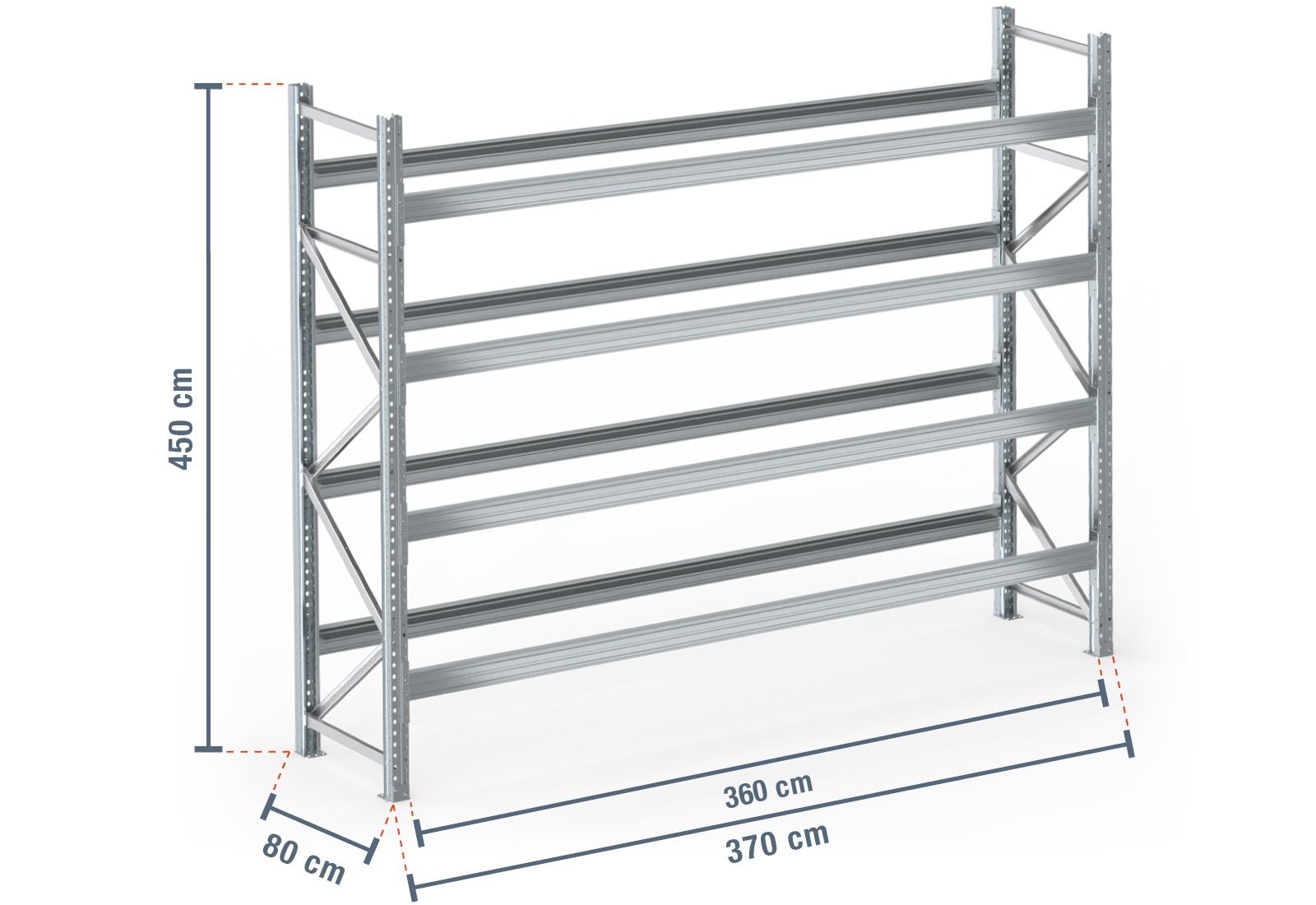 3,7 m pallet rack PR9000F galvanised / 80 cm deep / 4,5 m high / 4 levels for 20 euro pallets
