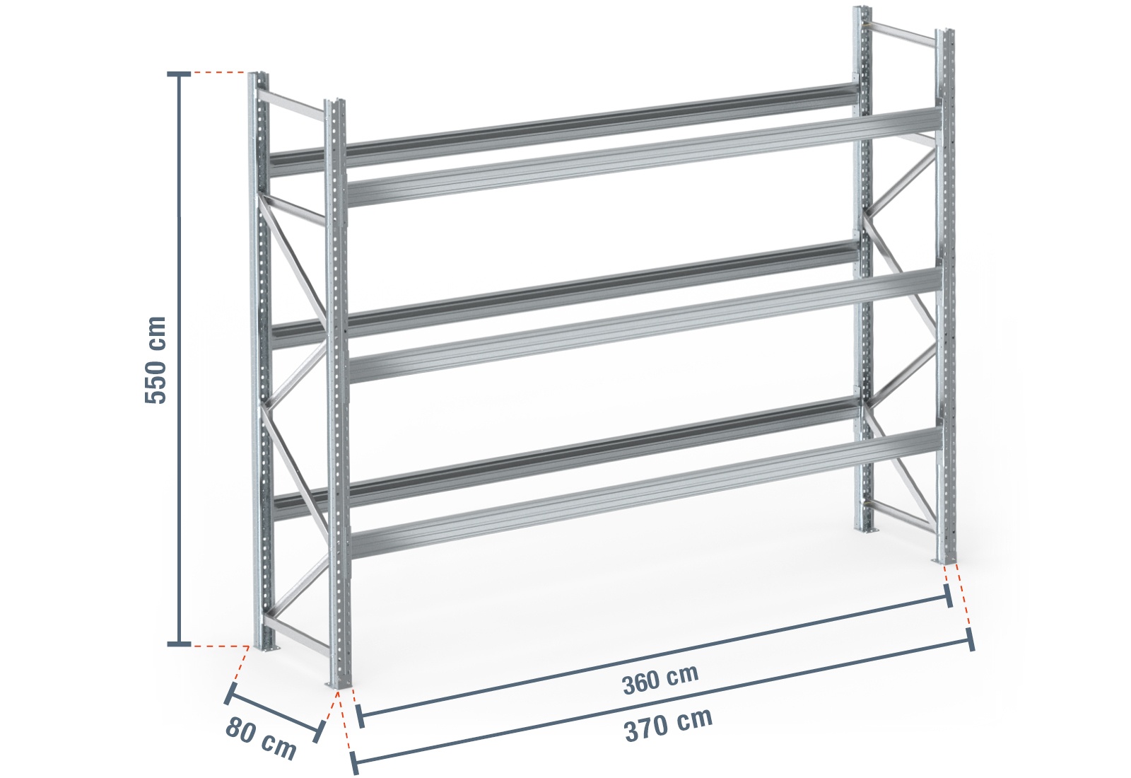3,7 m pallet rack PR9000F galvanised / 80 cm deep / 5,5 m high / 3 levels for 16 euro pallets