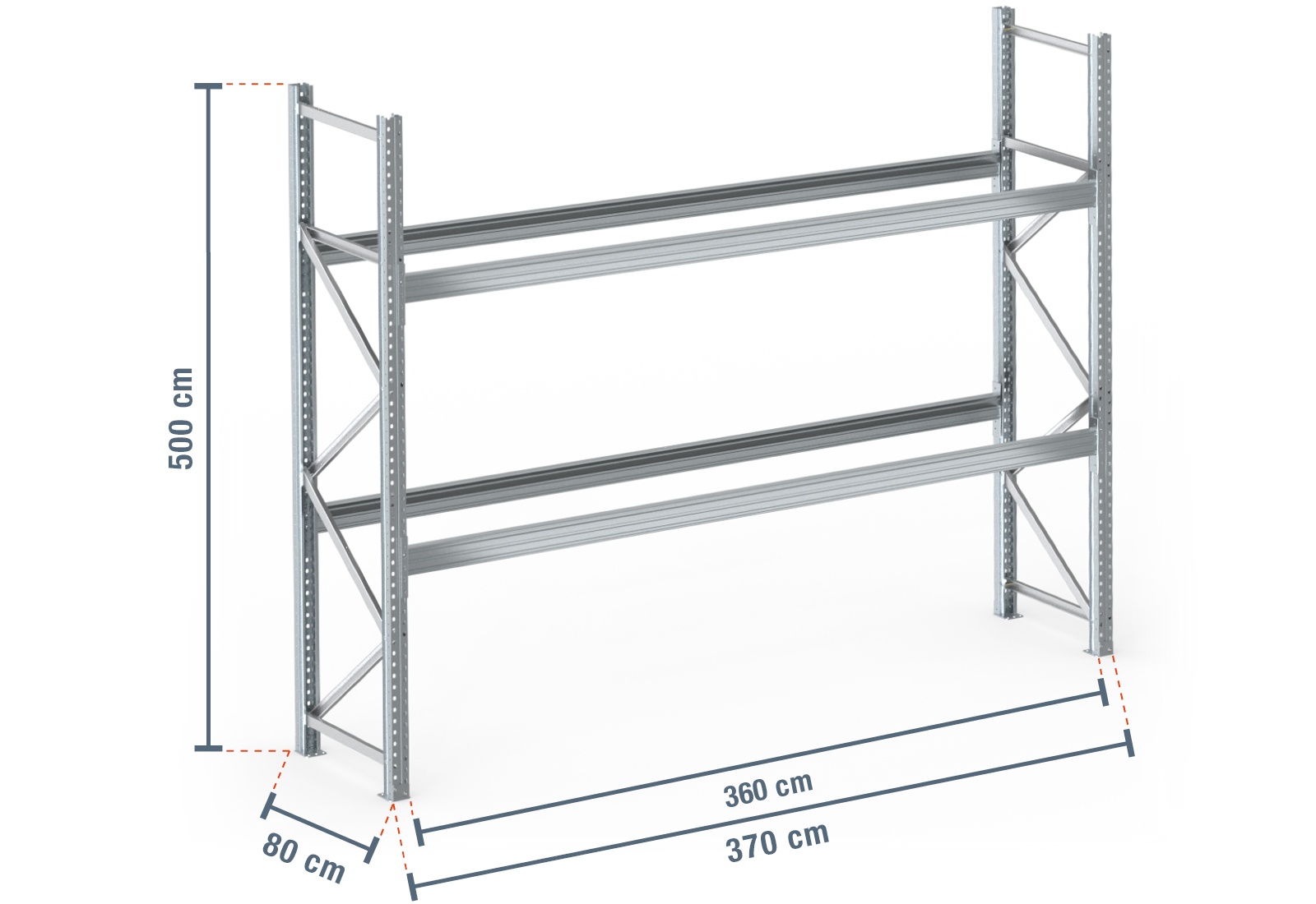 3,7 m pallet rack PR9000F galvanised / 80 cm deep / 5 m high / 2 levels for 12 euro pallets